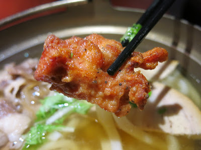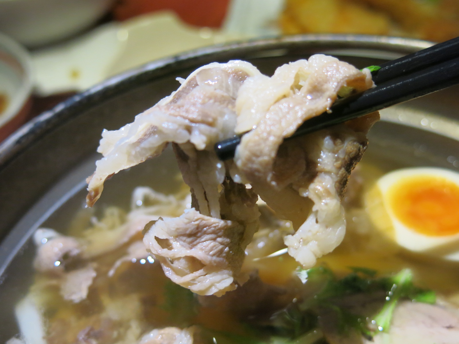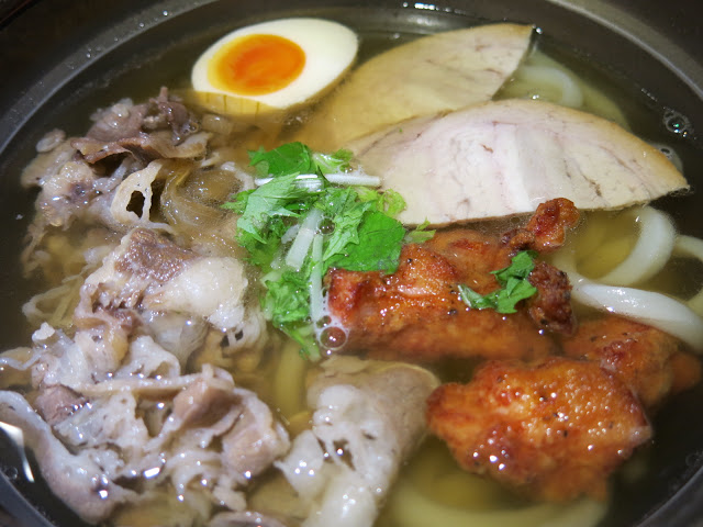 另外我們還點了香川屋著名的大三元烏龍麵,湯麵上有三種主配料,包含帶著油花的牛肉、炸雞塊和豬肉片,我們又另外加點了溫泉蛋。