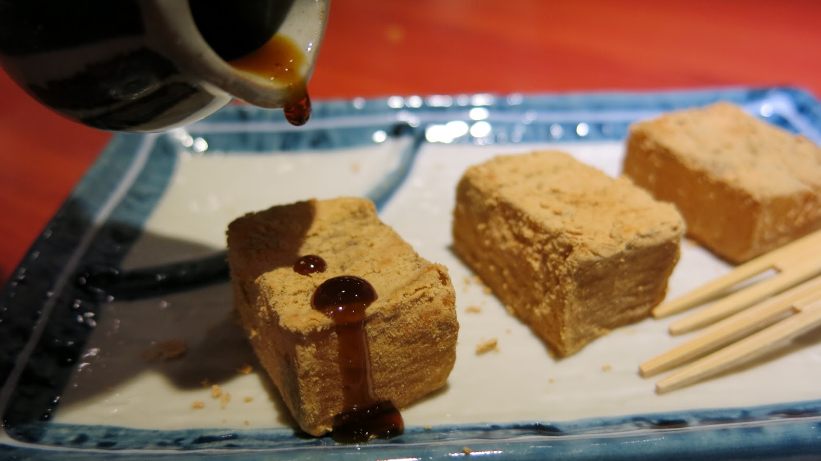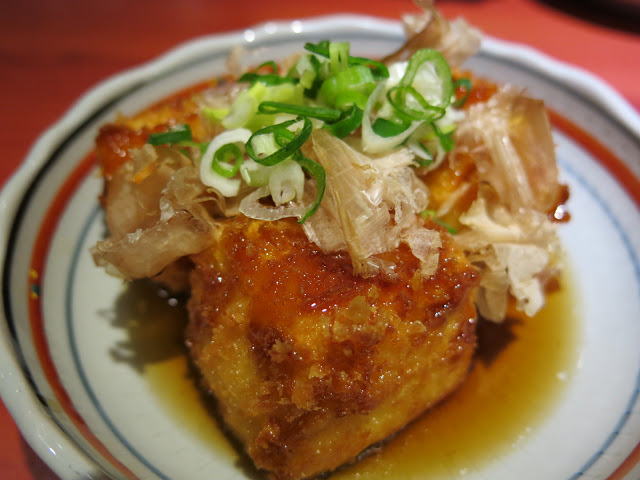 這份炸豆腐每個豆腐都比想像中還大,一口是絕對吃不進去的,酥脆的外皮與豆腐內餡的柔嫩形成強烈對比,剛上桌時柴魚被熱氣竄得活蹦亂跳,看起來相當誘人!