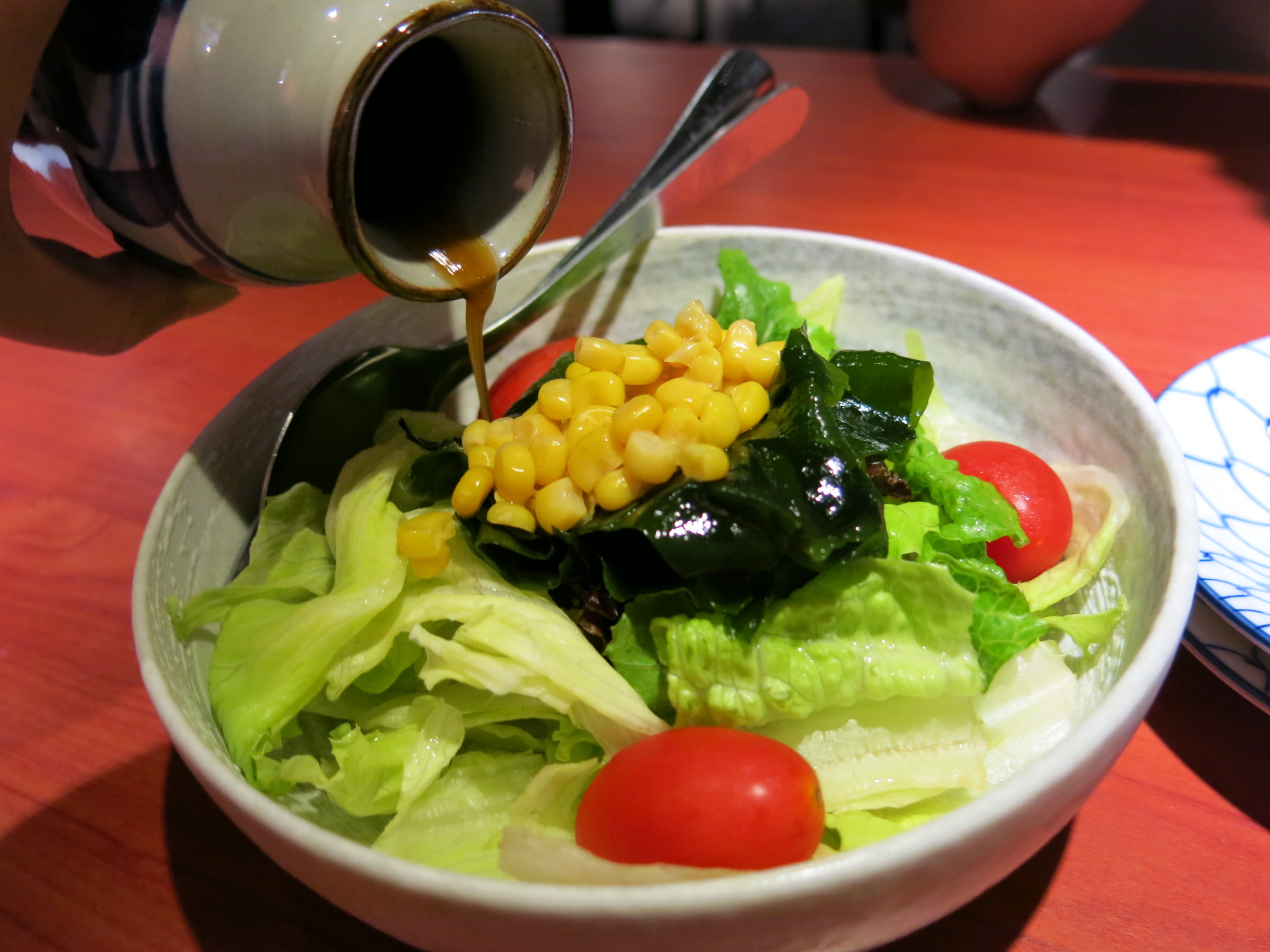 首先上菜的生菜沙拉,蔬菜種類很多,除了綠色葉菜還有玉米、整顆的小番茄和嫩海帶,附著一個陶瓶裝的和風醬汁,可以斟酌使用醬料,喜歡食物原味的我,稍微淋上一些醬汁引出蔬菜的鮮甜,新鮮的蔬菜爽脆好吃!