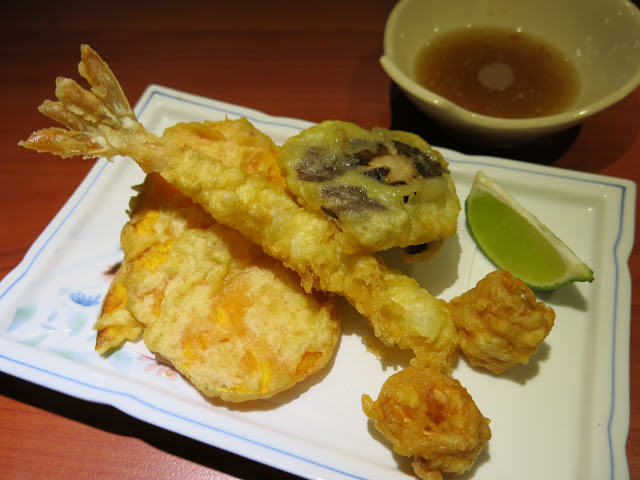 這盤綜合天婦羅,除了主角炸蝦以外,還有炸中捲、香菇、地瓜與南瓜,沾著蘿蔔泥的湯汁入口,讓酥脆與鮮甜一併在嘴裡釋放。