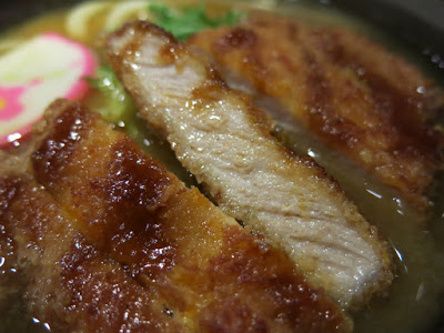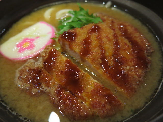 這碗味噌豬排烏龍麵以味噌湯為底,先品嚐上面的炸豬排,切成五塊的豬排,份量很多,一夾起來就發現,麵衣裹得很薄,完全是紮實的豬肉排去炸的,豬肉的部位選得很好,可以輕鬆咬斷,肉汁滿盈,上面的豬排醬稍微提味,非常好吃,在烏龍麵專賣店可以吃到那麼好的豬排,讓我很感動。