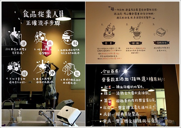 | | 在消毒清潔完後接著第二步驟就是原料篩選… 置物台上共有6種不同的豆類可供選擇(6選3)… 每一種豆類也都有標名對身體的益處… 光是挑選豆類的這一動作就讓我們好開心了XDD… |