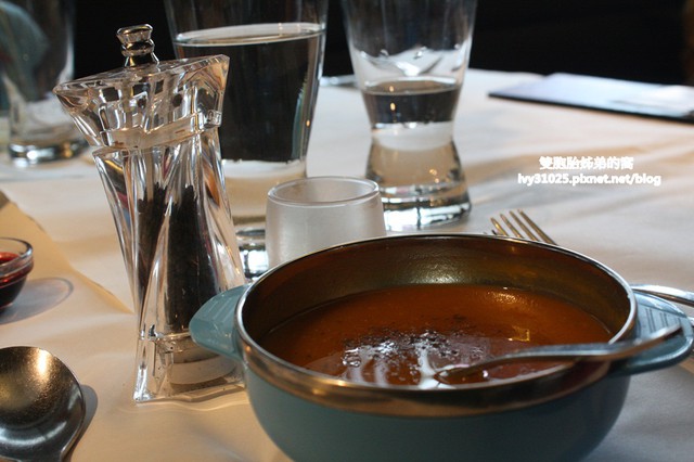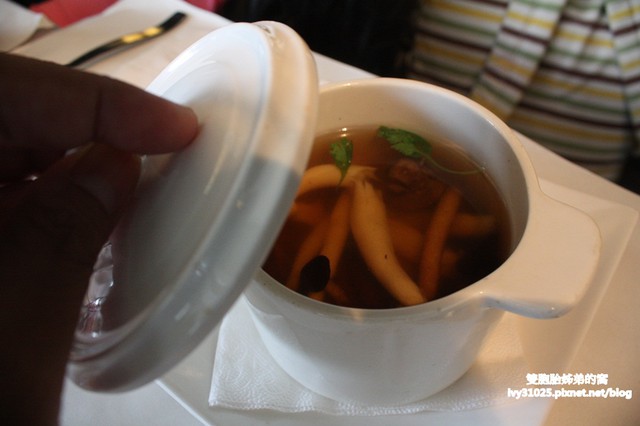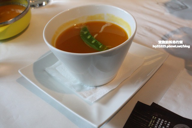 吃完鮮果沙拉後,舒果服務生會接著端上你點的米蘭南瓜濃湯 +清燉野菇湯和餐前