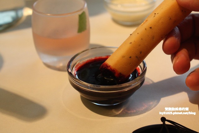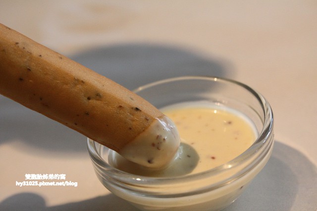 米蘭南瓜濃湯搭配送的餐前麵包可以搭配麵包沾醬,其中以藍莓沾醬最好吃