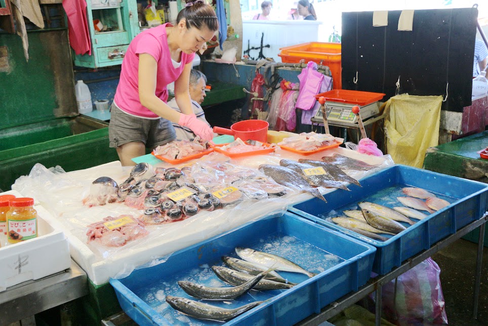 魚市場內各式新鮮魚貨超多的有許多攤位