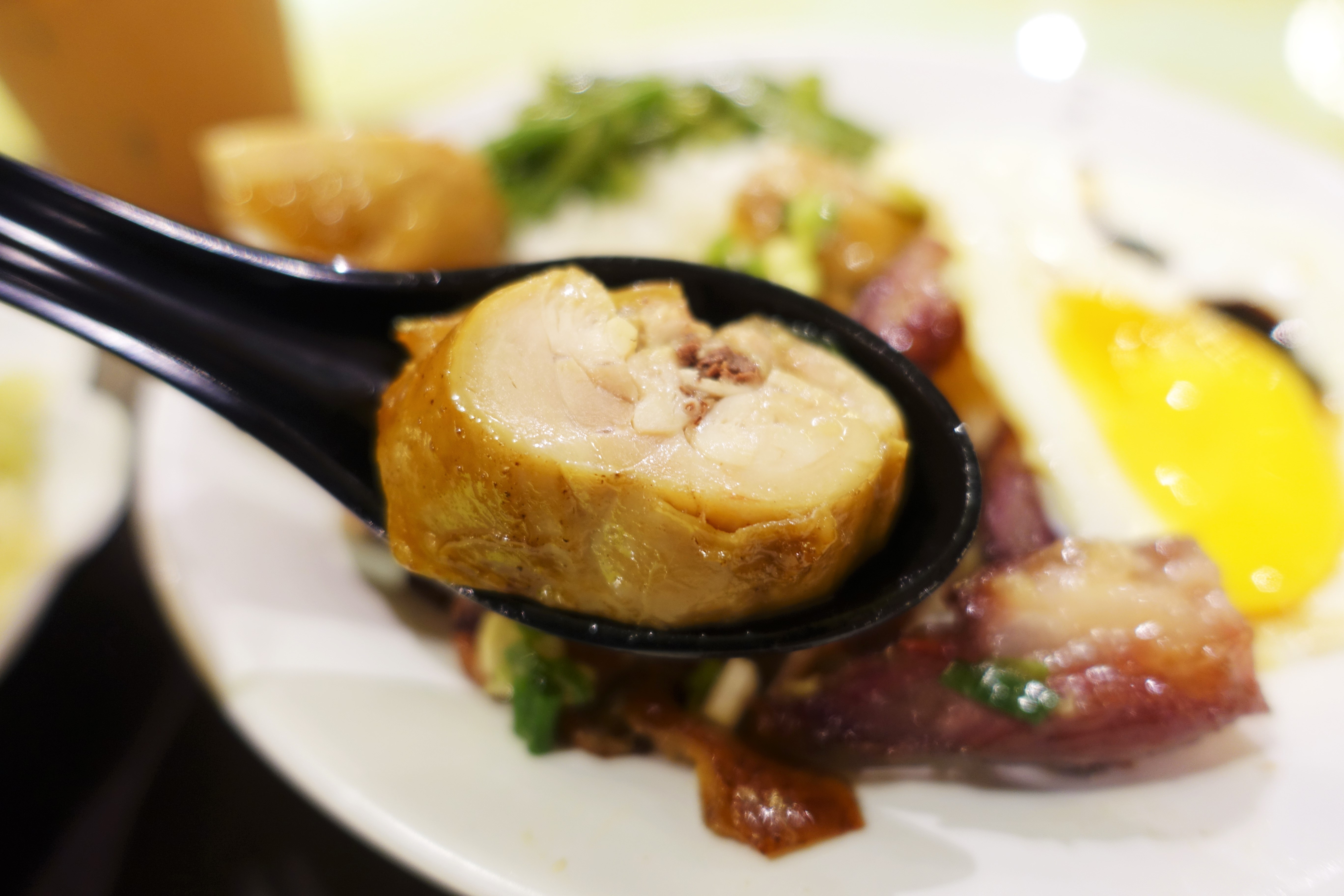 叉燒外觀油亮油亮的,一入口可以吃到醬汁淡淡的甜味,肉的口感則是相當軟嫩,猶記得當初老闆有特別提到,好的叉燒外觀應該要呈現暗紅色,而我們一般在外面有時候會吃到相當粉紅的,那是為了外觀好看,因此加入了一些其他成分,吃比來比較不健康。