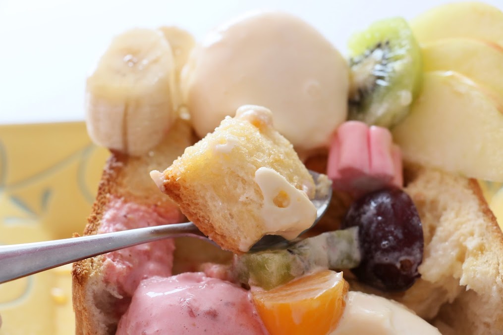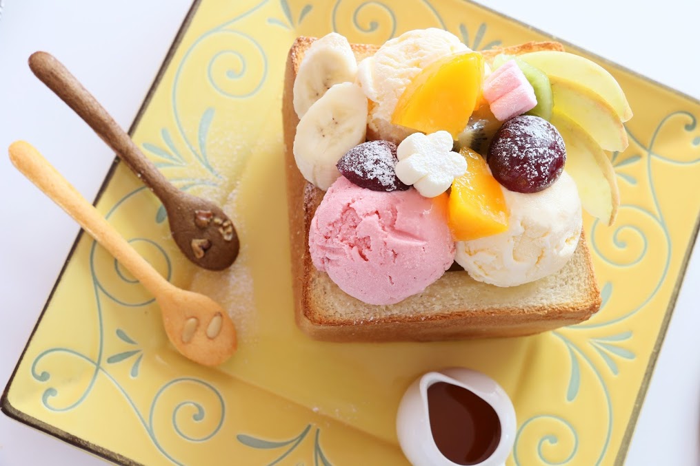 吐司磚上面擺滿冰淇淋與水果