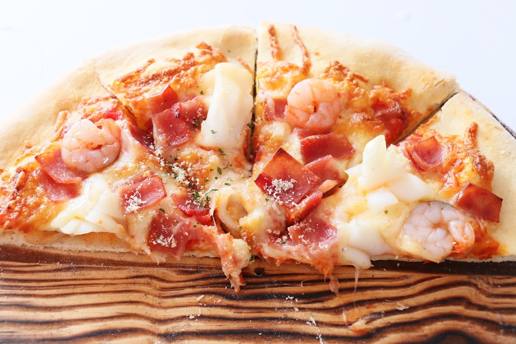 總匯的配料有鮮蝦、花枝、火腿!