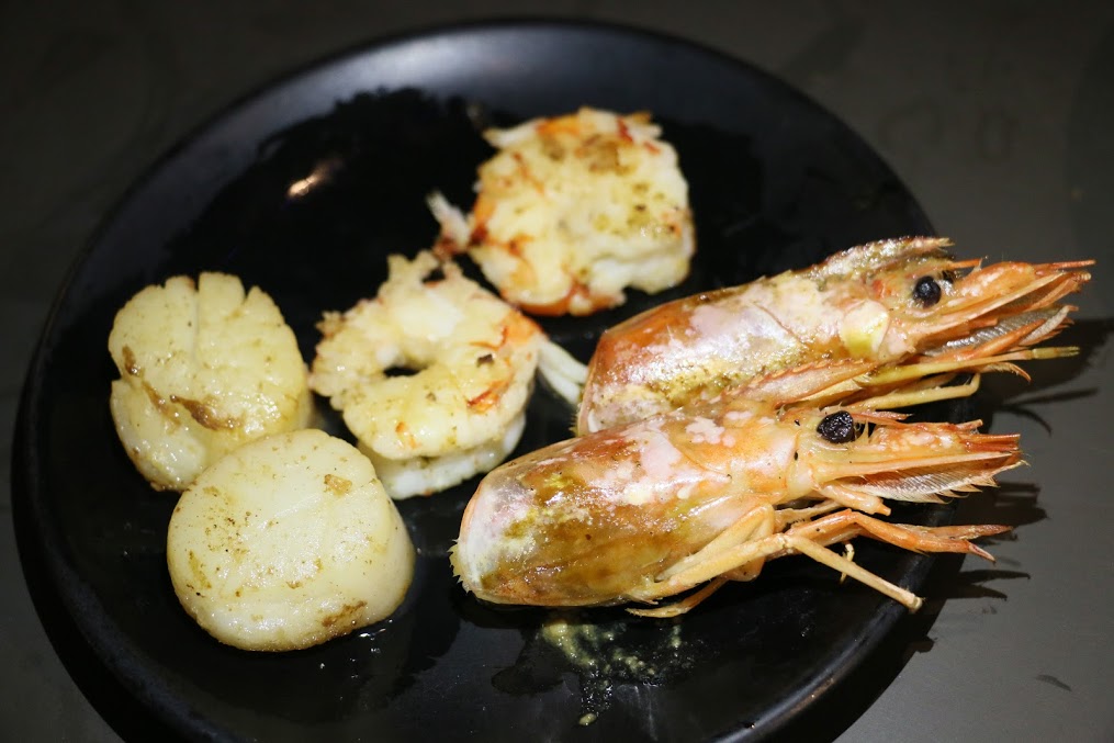 魚下巴、鮭魚肚、油魚排、花枝、鮮蝦、扇貝等