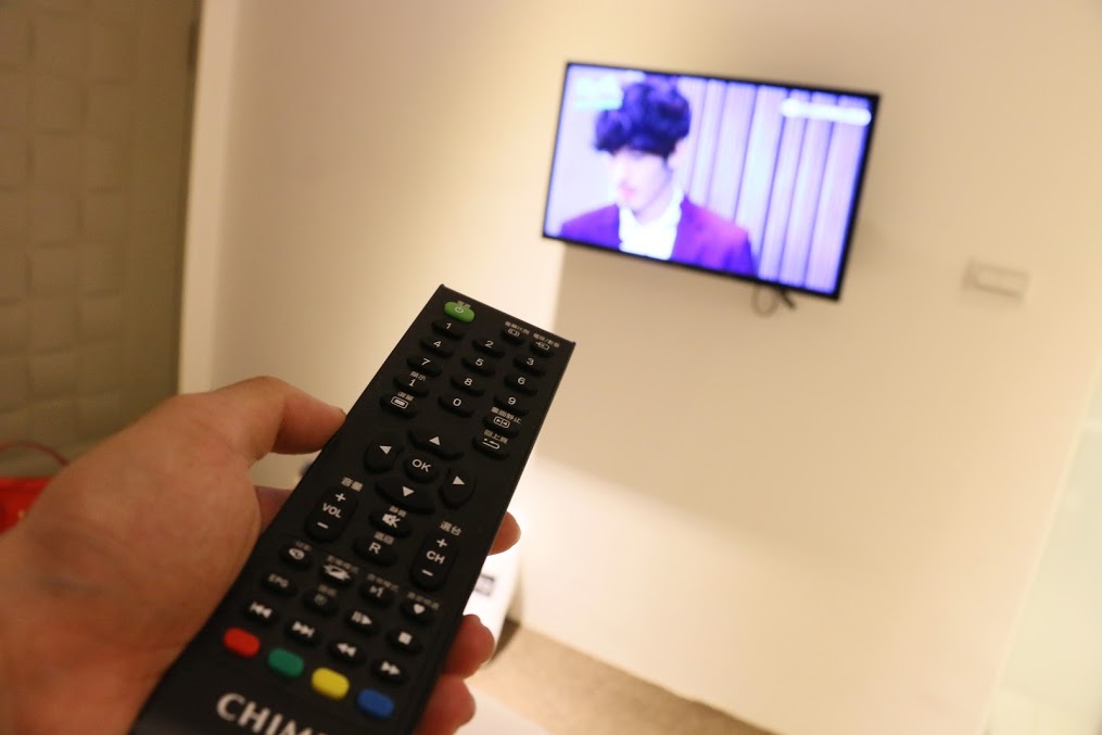 桌上有面紙、電視遙控機、兩瓶水、杯子與茶包、熱水壺