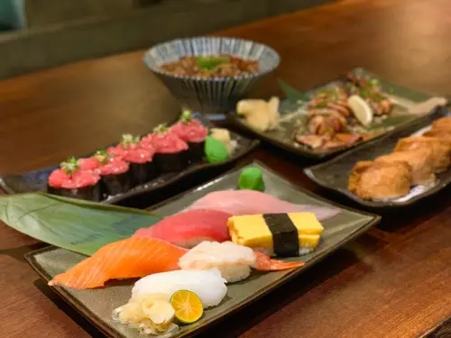 鮮美的海膽丼飯,甘甜醋飯的滋味,一點哇沙米,一口握壽司、生魚片,天婦羅蔬菜炸物和味增湯,新鮮的魚產將之切片厚薄適中,生魚片與握壽司在桌上鋪展開來,夜晚時分微雨,躲進日式料理店品嘗來自海洋的贈禮。