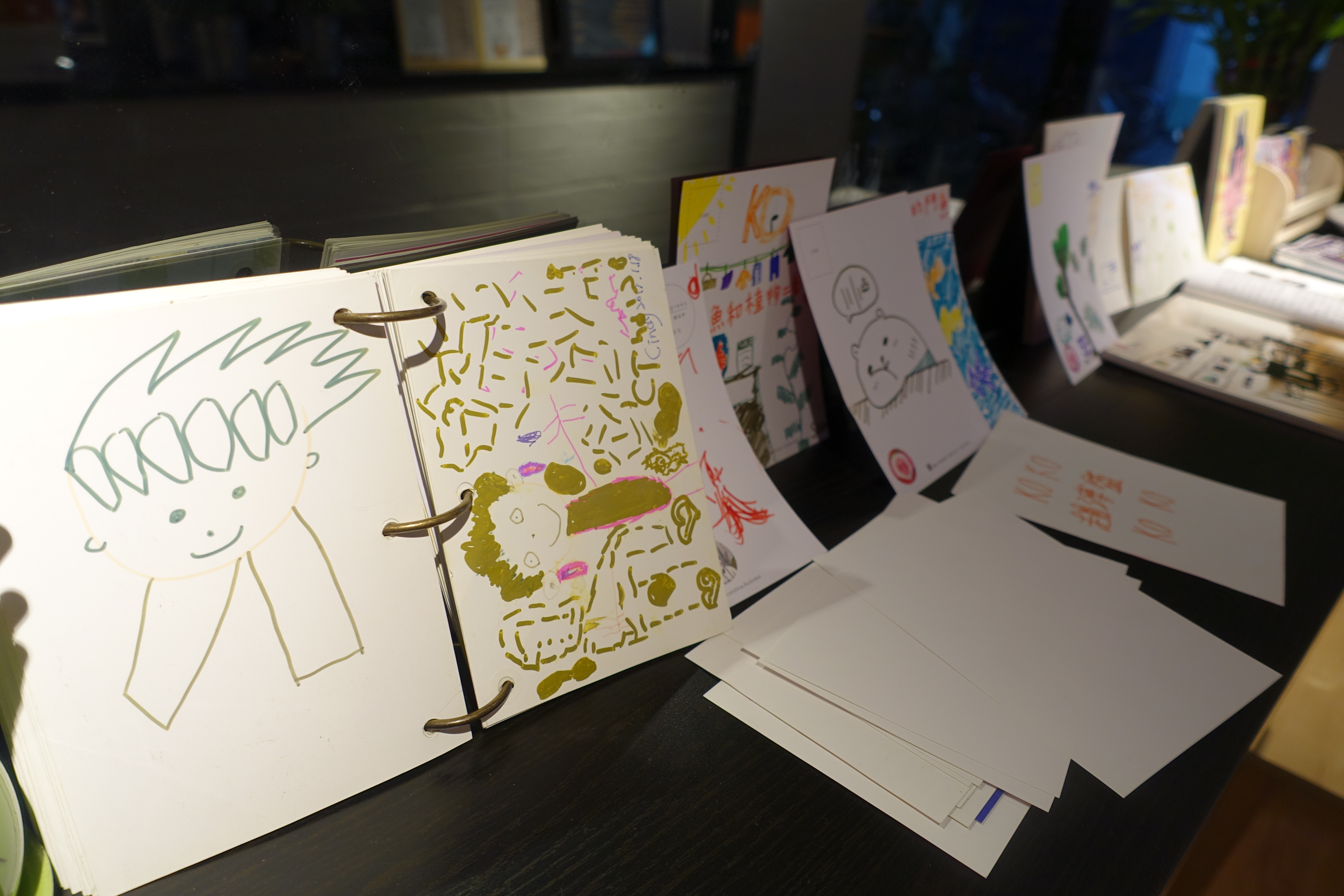 ▼入門右手邊類吧檯區放滿了客人的畫作