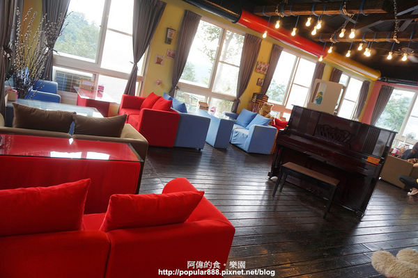 沙發的顏色很多彩,窗戶很大,可以將外面的山景盡收眼底