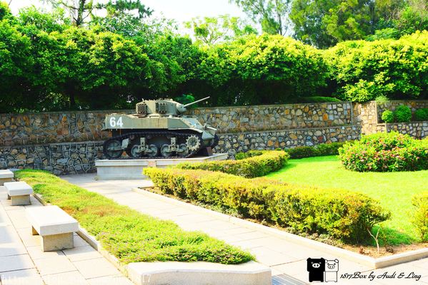 兩旁立有當年曾參加古寧頭戰役的「金門之熊」戰車,