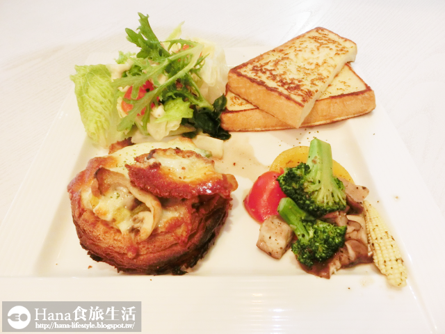 盤邊還有附凱薩沙拉、法國吐司和清炒蔬菜,份量也是多多多!