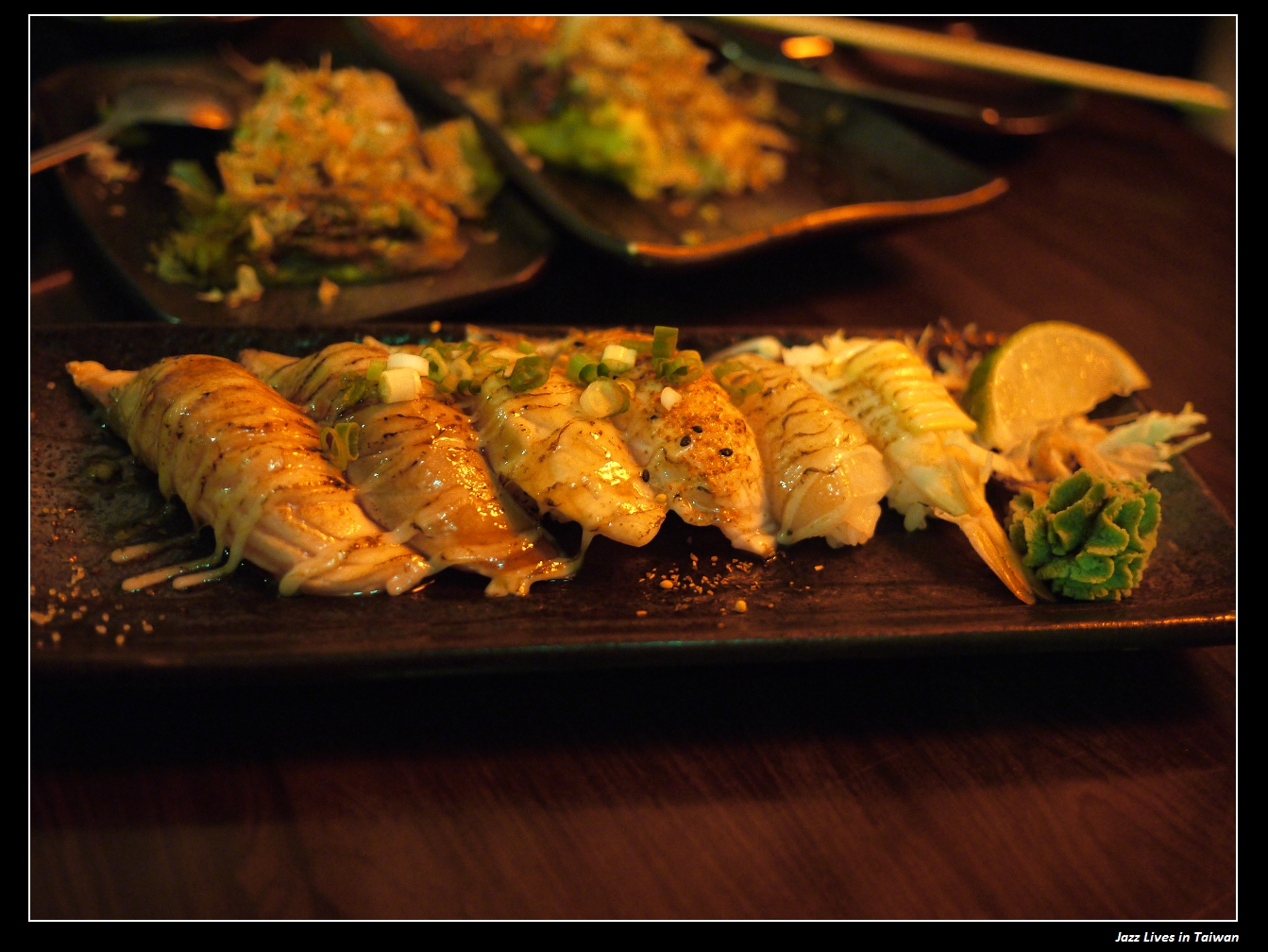 這是由不同的魚肉握壽司炙燒製成, 淋上美乃滋灑上蔥花, 還附上哇沙米與檸檬片, 多種層次同時綻放於味蕾, 怎能不美味呢?