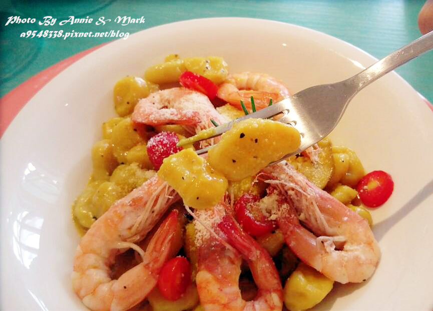 黃金鮮蝦麵疙瘩,份量不少喔!上面還給了5隻蝦子說....
