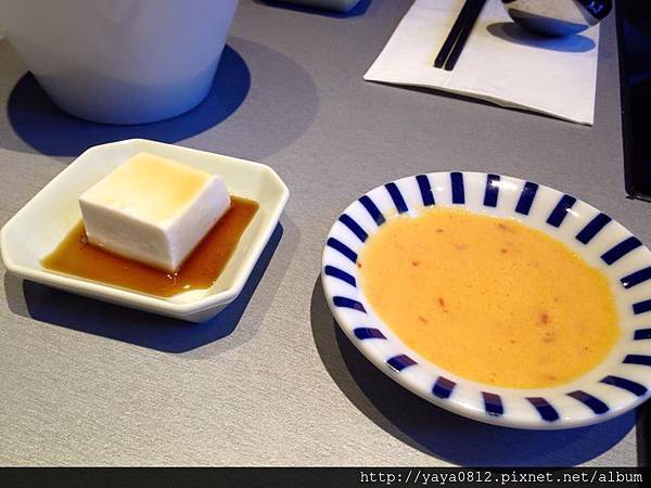 左:前菜 (忘了名字,吃起來有點像豆腐的口感)