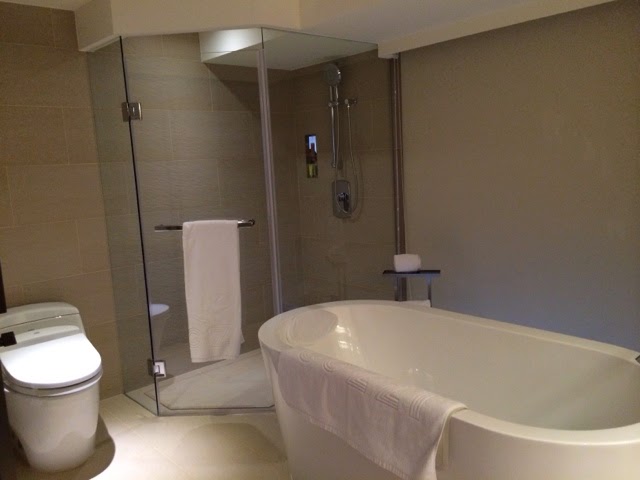 浴室在長方形的房間的盡頭, 面積是和睡房不合比例地寬敞 (真的很大...@@), 乾濕分離, 大浴缸放中間. 浴缸旁是一扇大落地玻璃, (深夜沒人看到時)還可以開窗浸浴... 雖然哈比是關著窗簾洗澡的, 但在這麼一個大浴室慢慢浸浴放空, 實在很享受!