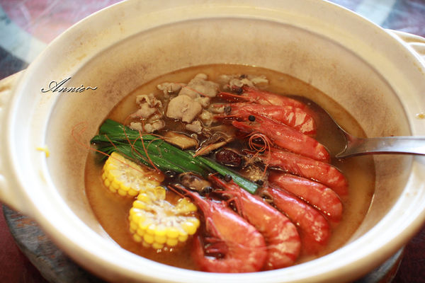 蝦子放在這麼大的陶鍋裡顯得好渺小喔!!