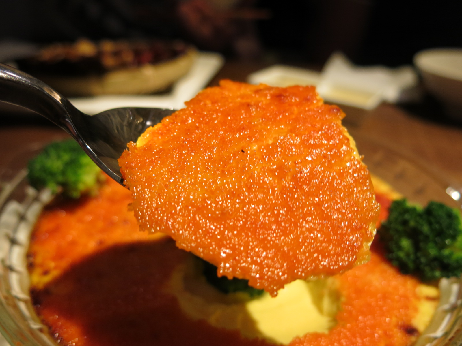 明太子海鮮烤蛋上桌時,大家也是哇了一聲,視覺上真的很吸引人,明太子烤得香氣四溢,一瓢舀起,蛋烤得很紮實卻依舊滑嫩,搭配上明太子醬讓人覺得很有特色。