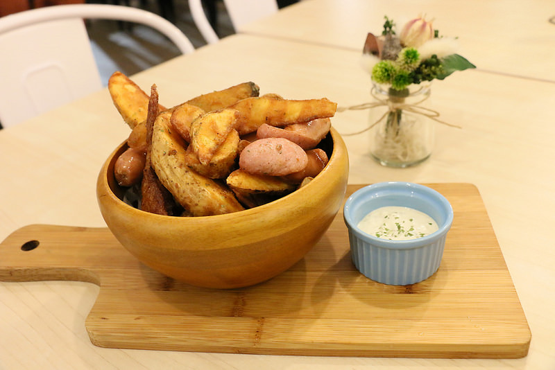 裡面有帶皮薯塊、德國香腸、紐澳良炸雞翅