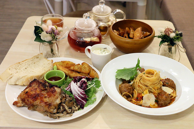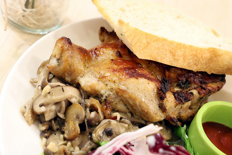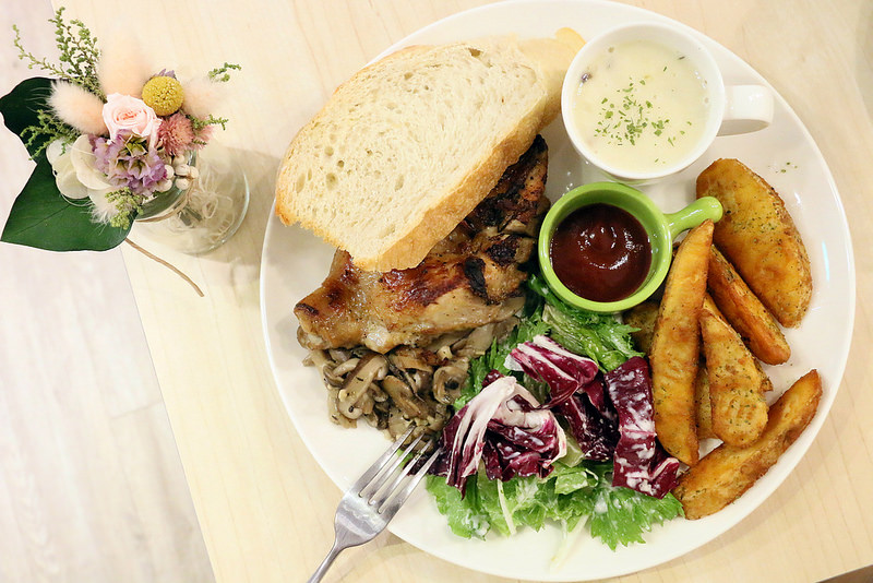 手作麵包、義式香料雞腿、野菜沙拉、炒菇、帶皮薯塊