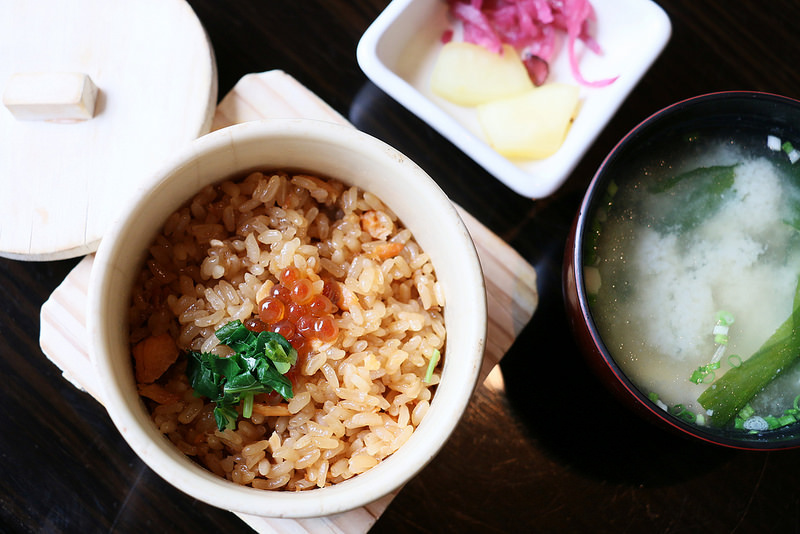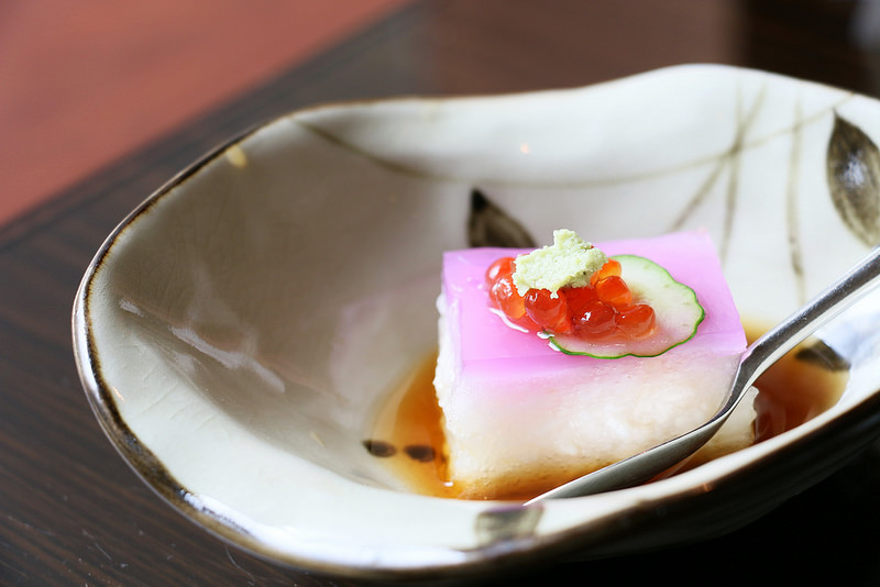 雙色山藥上頭堆疊鮭魚卵及現磨山葵