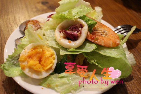 首先上桌的是木碗沙拉-地中海漁夫海鮮佐莎莎醬