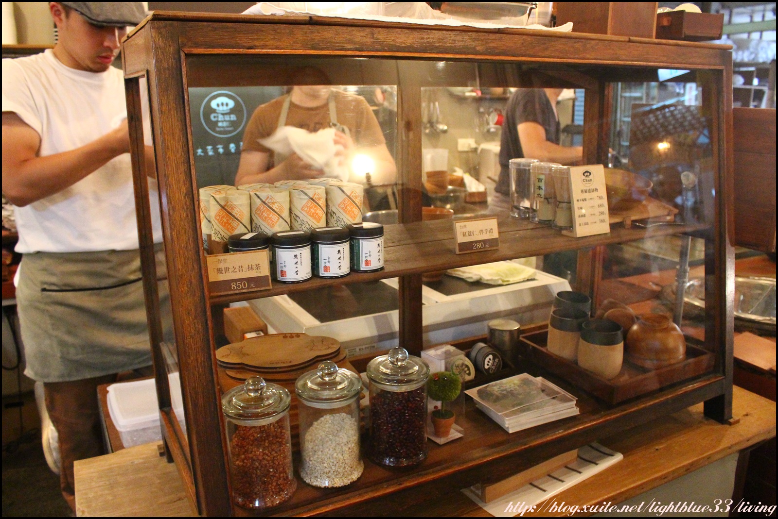 他們也有販售抹茶、薏仁跟茶具,還用很台灣味又很文青的櫃子裝