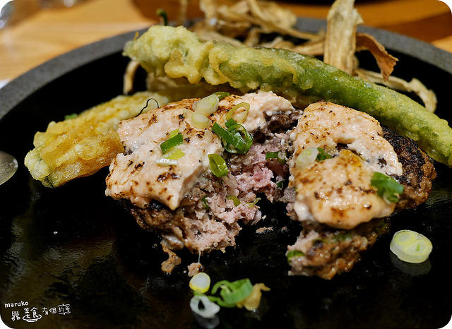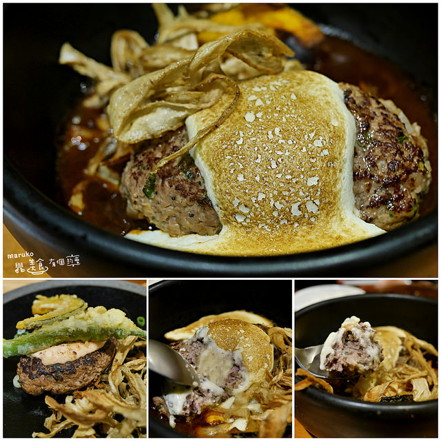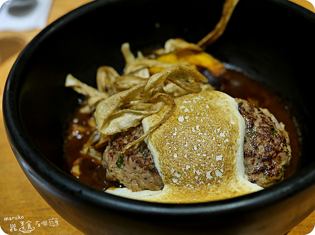 藍乳酪綜合菇奶油菇餡,淋上了八丁味增特製醬汁,上層再將乳酪炙燒後流入了漢堡排的表