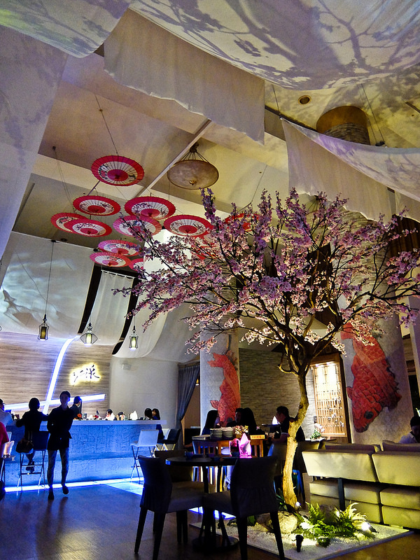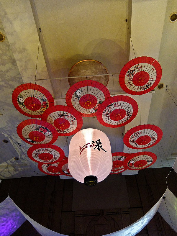 打開後, 挑高的屋頂的裝璜頗具巧思, 紙傘與燈籠的組合很美呢