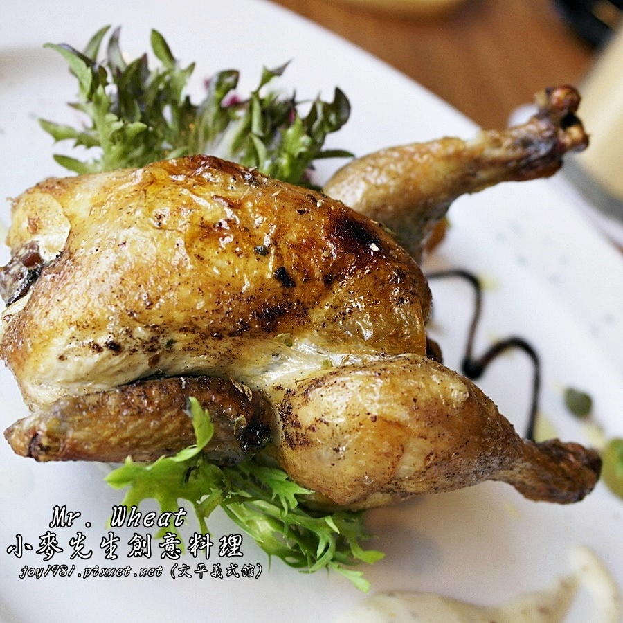 裏頭這道"爐烤香料小春雞佐奶油芥末籽醬"掛上了"限量提供"和須提早預定地要求讓我想點卻又怕沒事先預訂被拒絕,