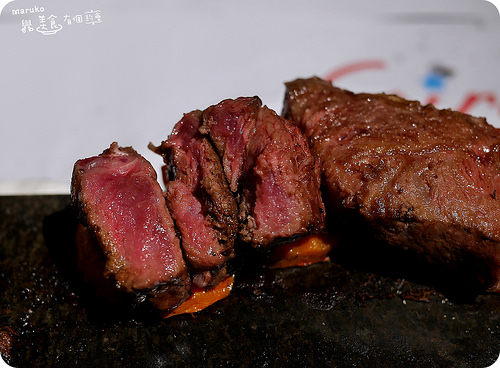 帶有一點油脂的,外層鎖住了肉汁,吃起來有一點焦焦的,裡面卻是紅色的肉質,約五分熟