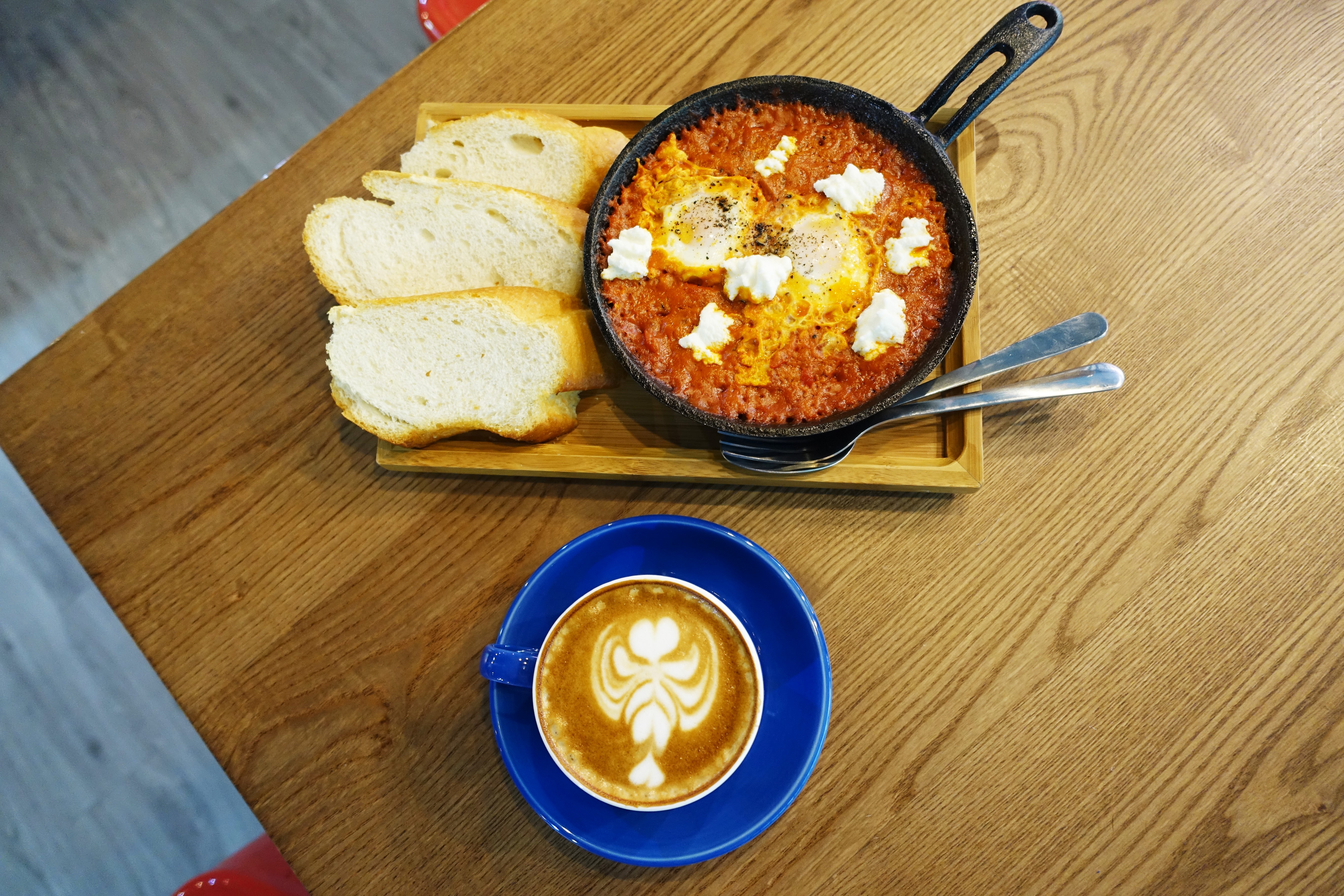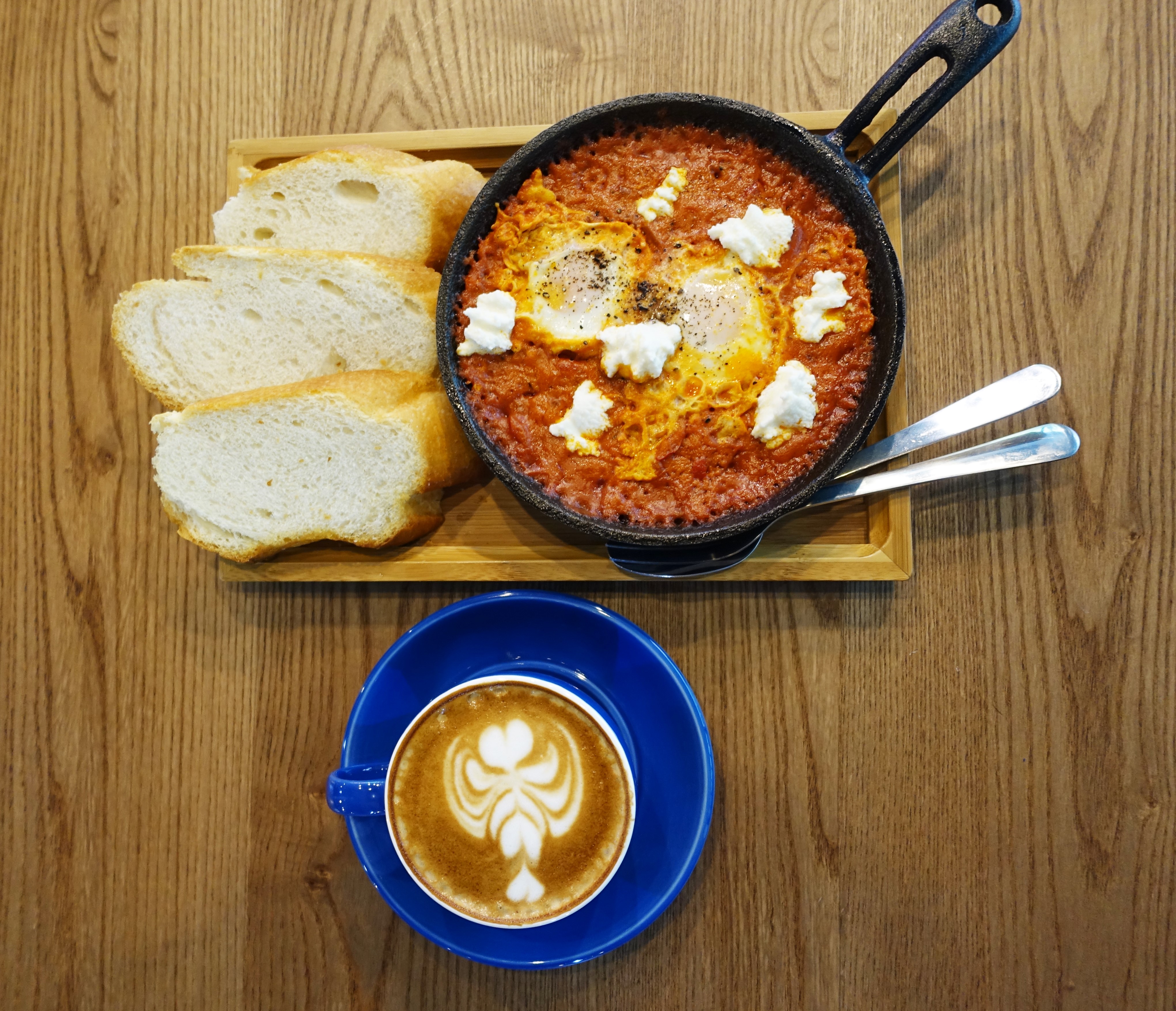 當天哥是早上到達的,因此除了拿鐵外還點了店內唯二的輕食-澳式番茄辣烤蛋。