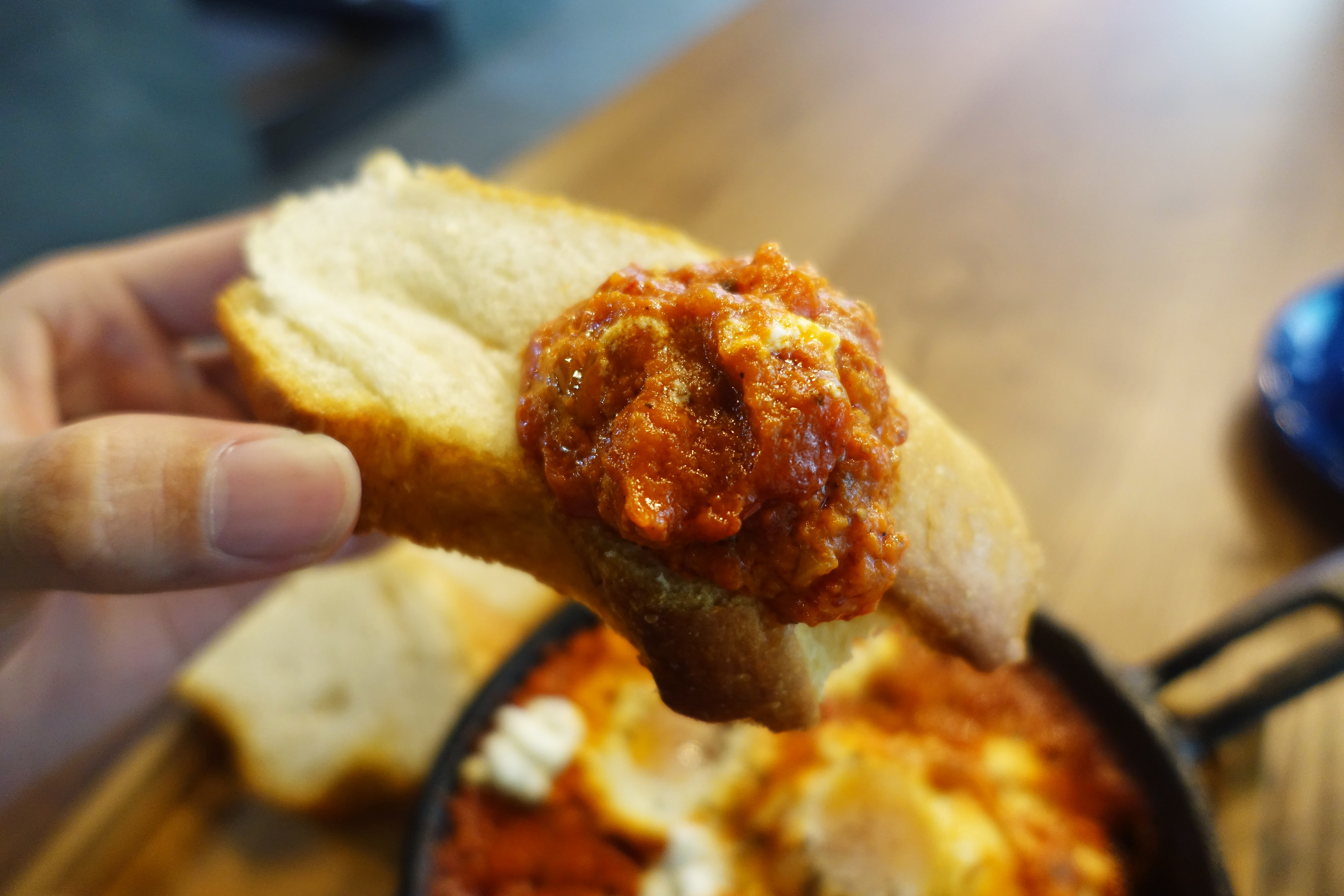 如果真的很怕單吃會油膩的人,可以先試試與附餐法國麵包一起配著吃,店家選的是口感比較札實的法國麵包,除了可以吃到麵包本身的香氣外,番茄烤蛋又讓單調的麵包風味多了一個層次。