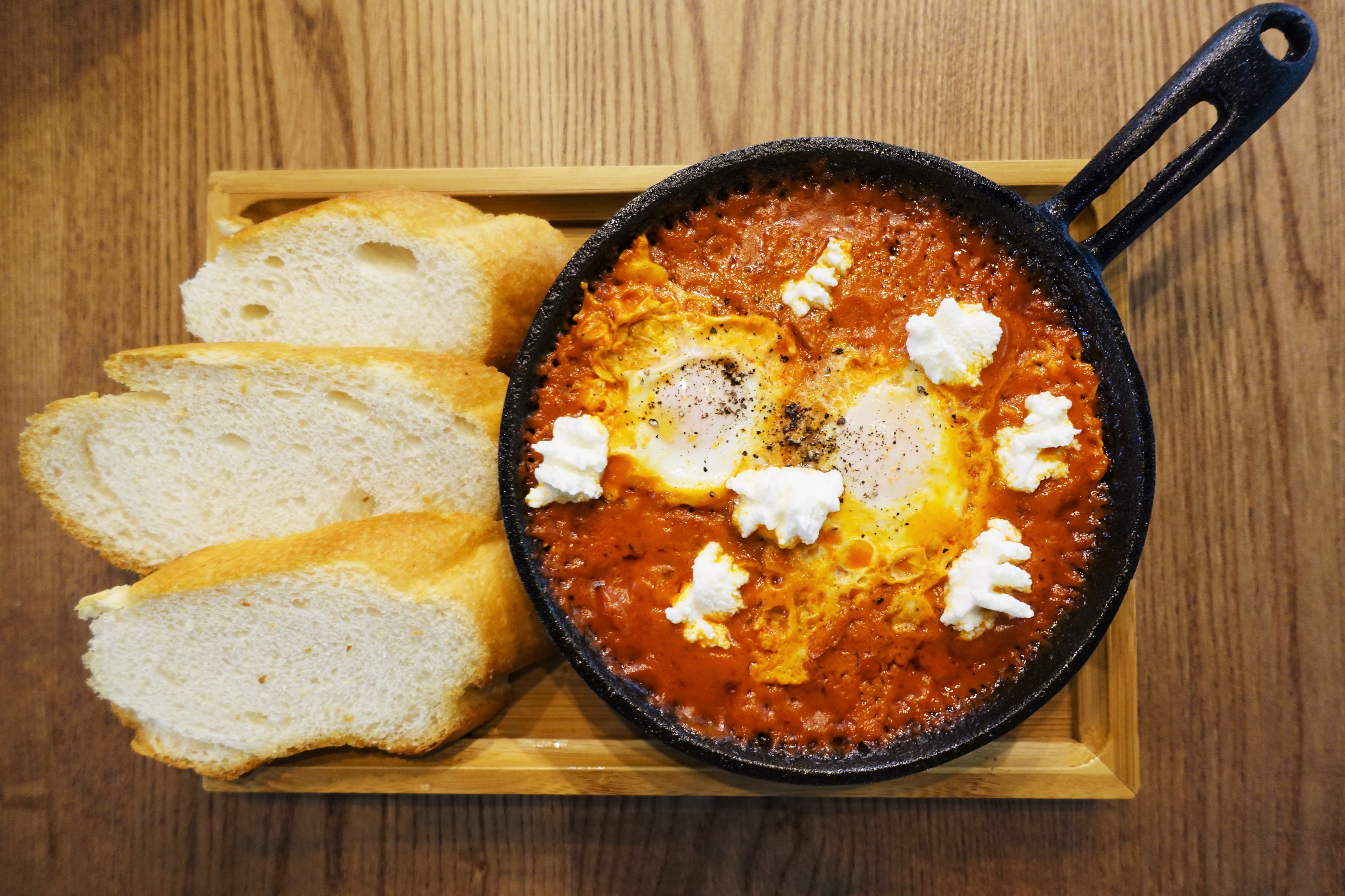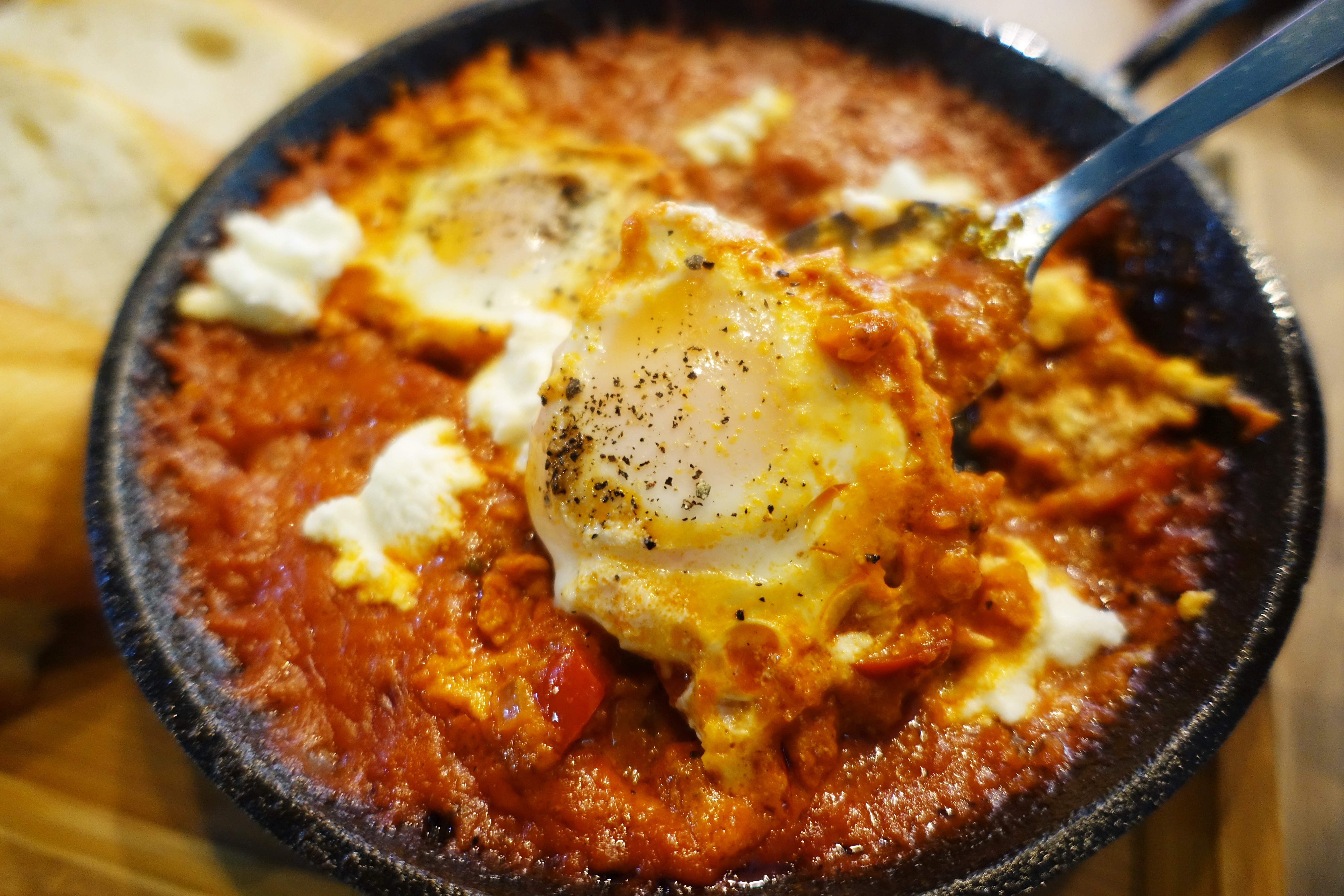 這道澳式番茄辣烤蛋的食譜是有段故事的,過去老闆還在澳洲時,是在咖啡廳上班,而咖啡廳的主廚在知道這位來自台灣的年輕人決定回台開咖啡廳後,便將一本私藏的食譜分享給他,然後烤蛋就是其中之一,所以現在瞇瞇眼才有這道來自海外的美食。