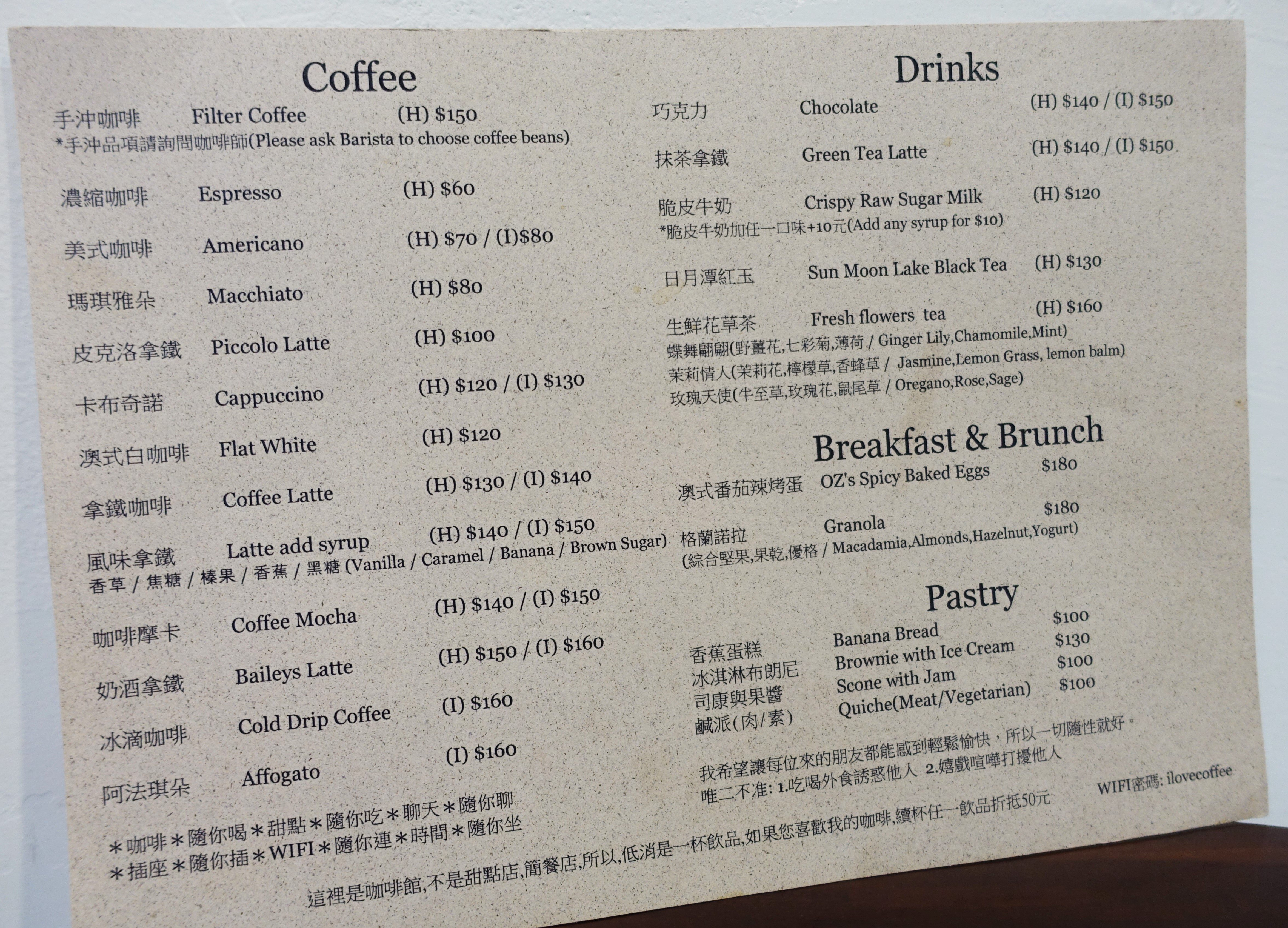 瞇瞇眼自家烘焙咖啡館的價位坐落於$60~$180之間,非常的平價,店內以咖啡為主打,販售義式咖啡、精品咖啡、甜點與兩種輕食。