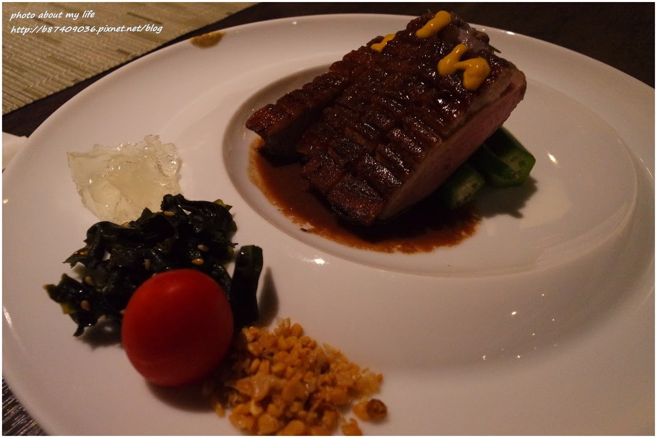 旨味的紅酒櫻桃鴨胸佐檸檬凍 切成厚片的鴨胸肉口感紮實飽嘴 油脂少卻不乾柴 私心覺得比便宜坊好吃XD