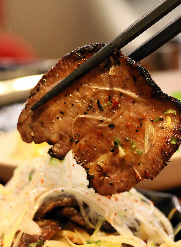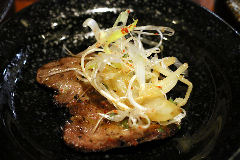 放上牛舌,再放上蔥絲與調味