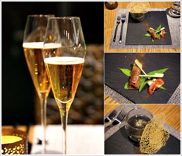| | 在看完環境又睡著小覺起床後就準備來享用美味的晚餐了… 松邑莊園的晚餐有牛、羊、豬等不一樣的主餐… 每一道擺盤都相當美,而在這麼燈光美氣氛佳的環境當然要再搭配香檳才盡興啦… |