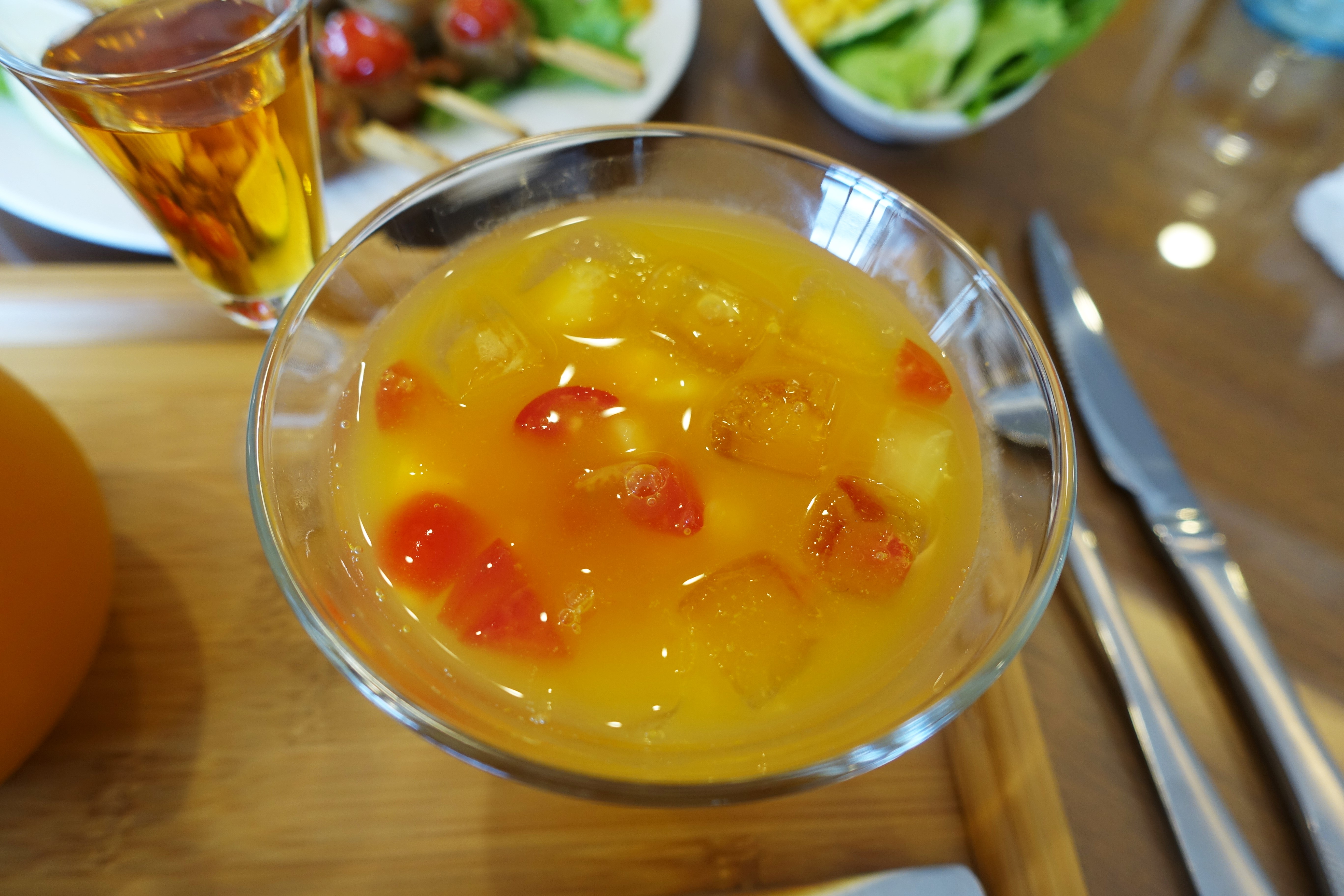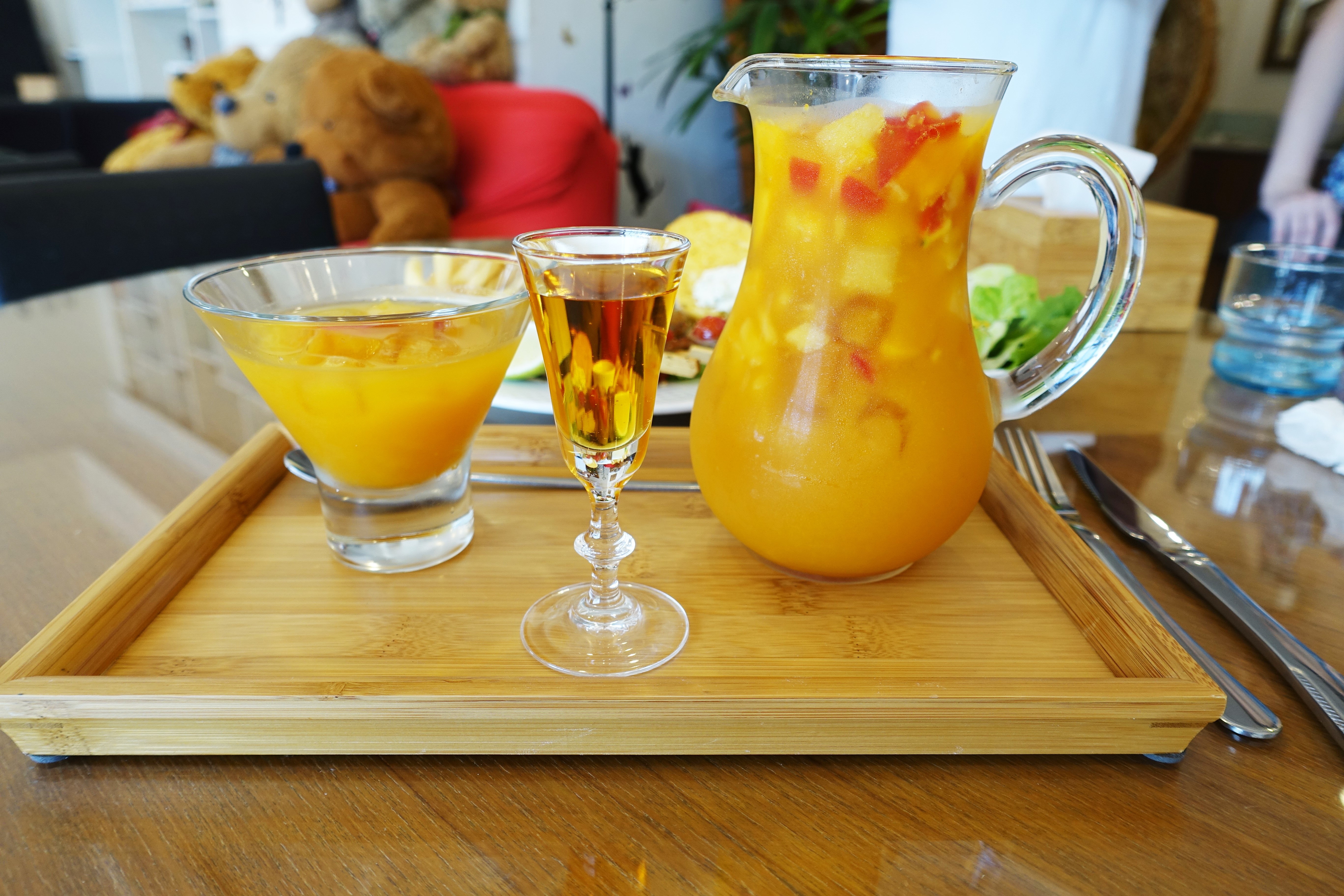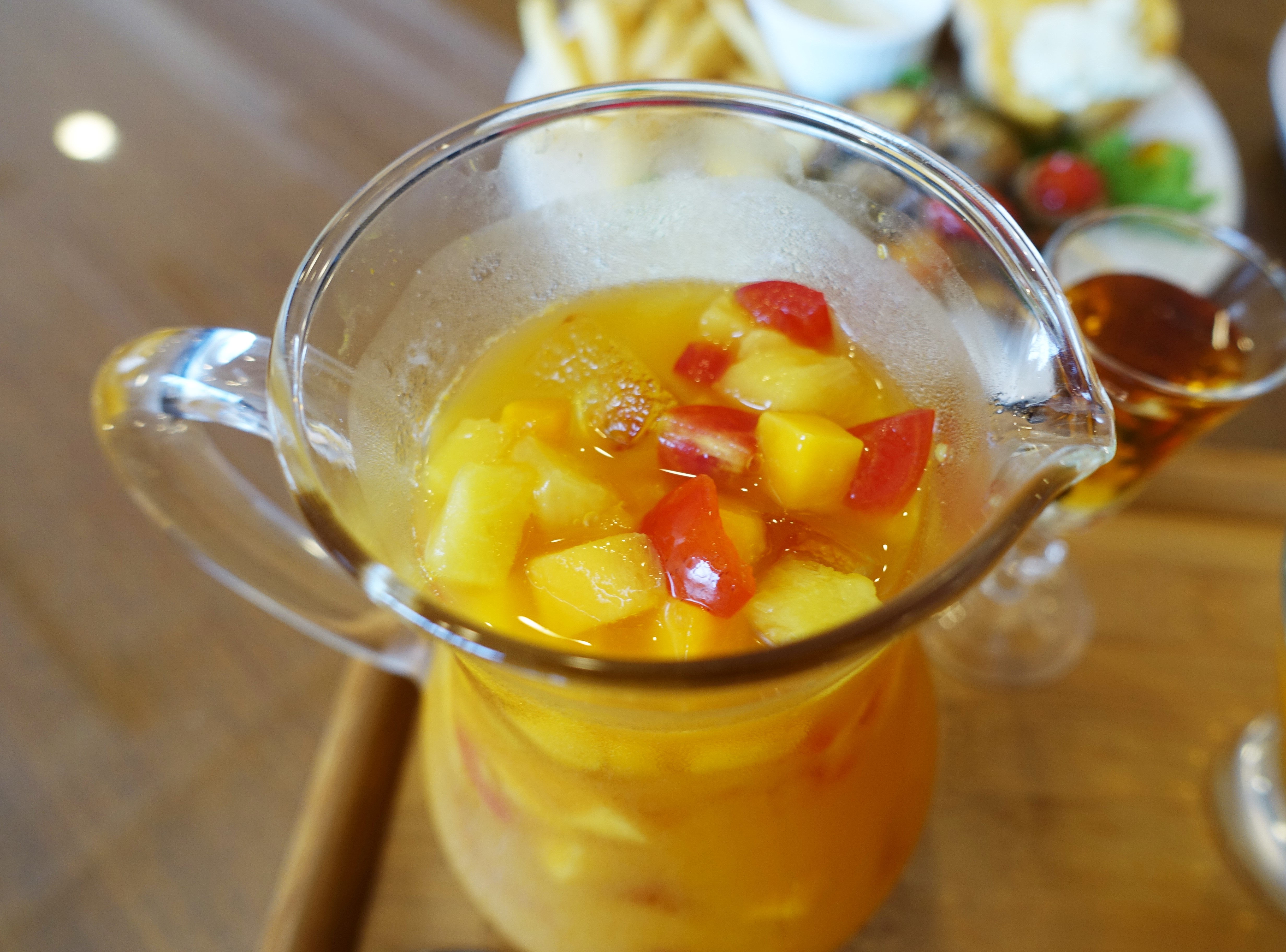 飲料部份我們點的是鮮果茶,米蕾咖啡的鮮果茶使用3種當季水果(當天是芒果、番茄與鳳梨)、檸檬汁與果露,整體而言是酸酸甜甜的風味,還可以可以吃到豐富的水果。