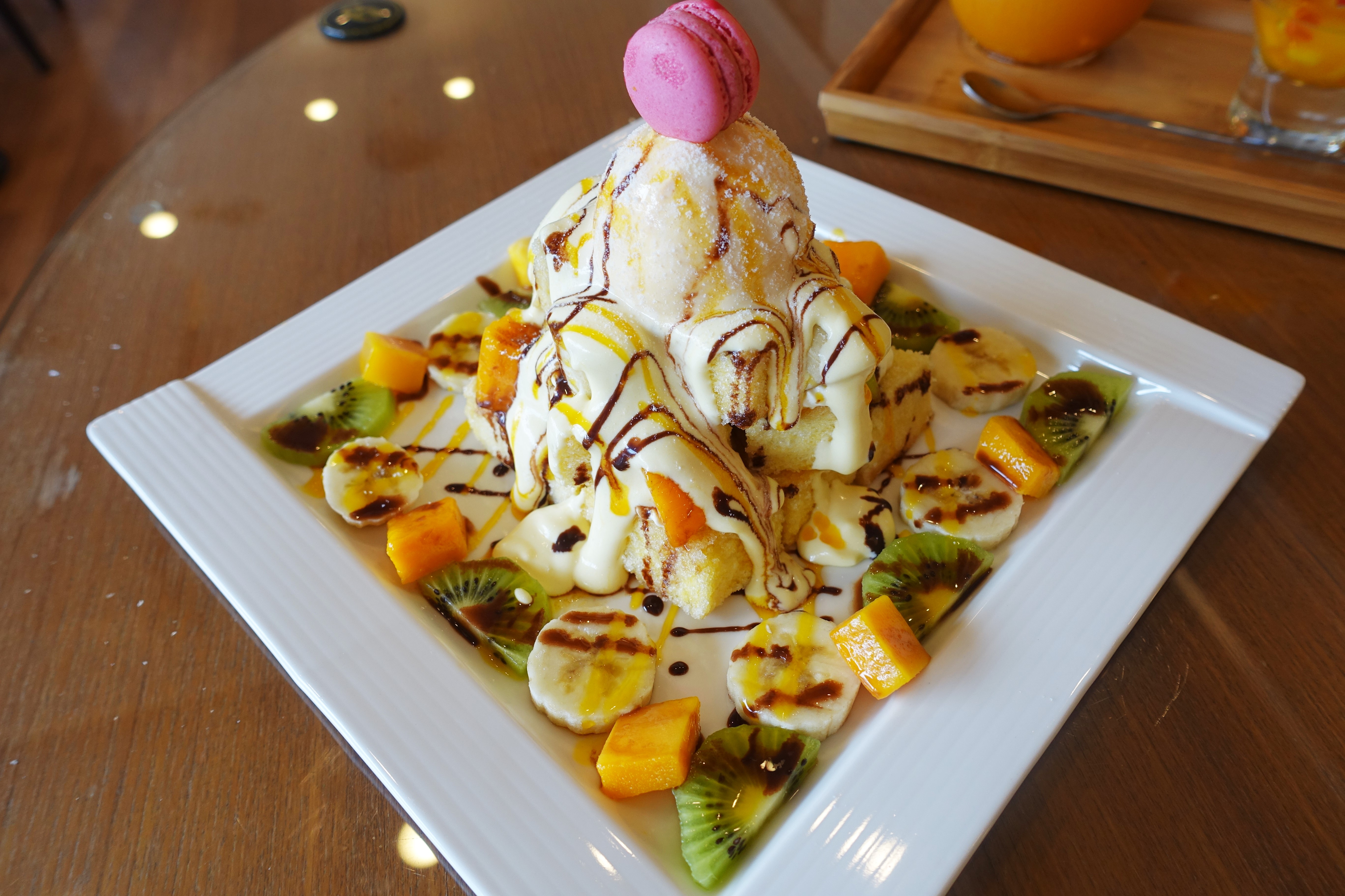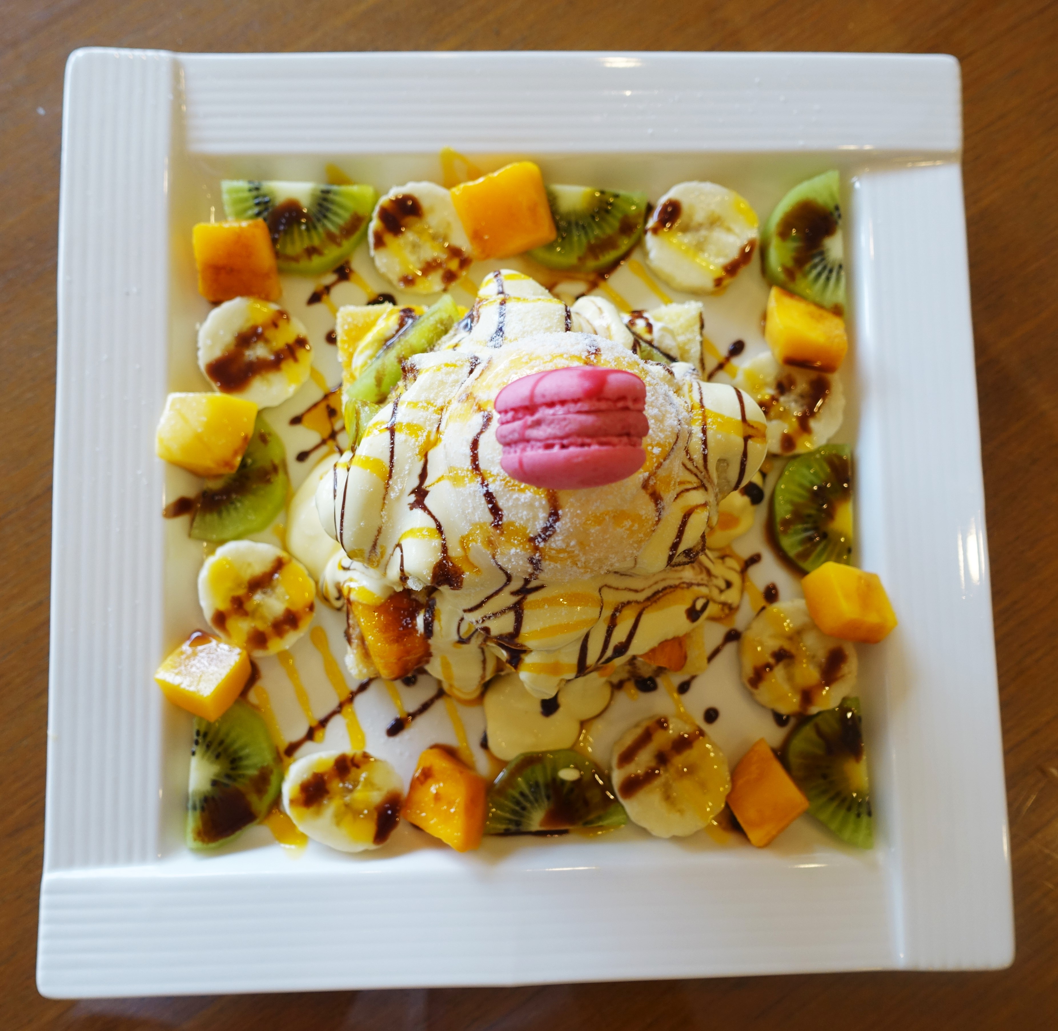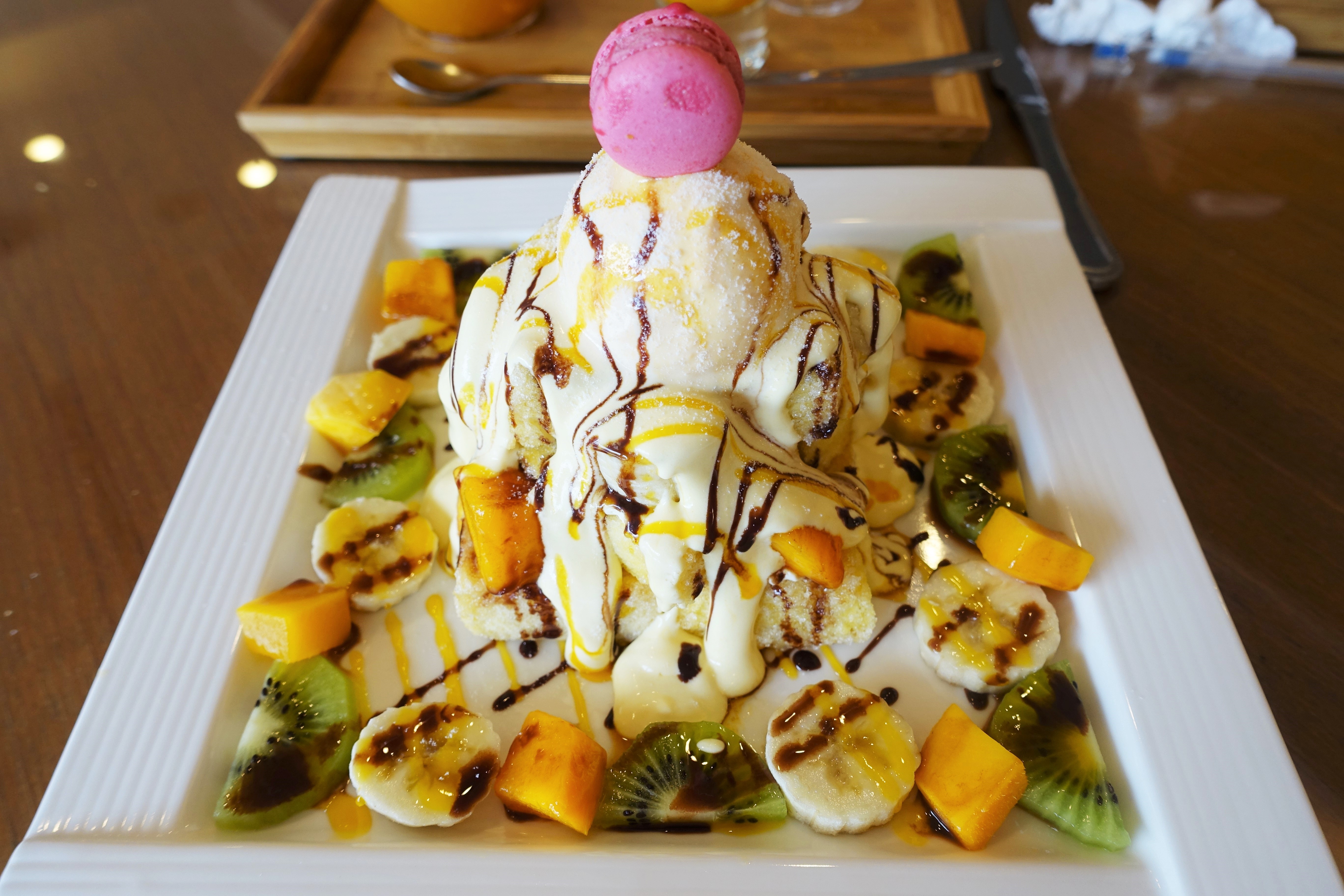 蜜糖塔淋上鮮奶油,上層放上冰淇淋與馬卡龍,再擺上香蕉、芒果與奇異果,最後再加一點巧克力醬提味,這會讓少女瘋狂吧 哈哈哈。