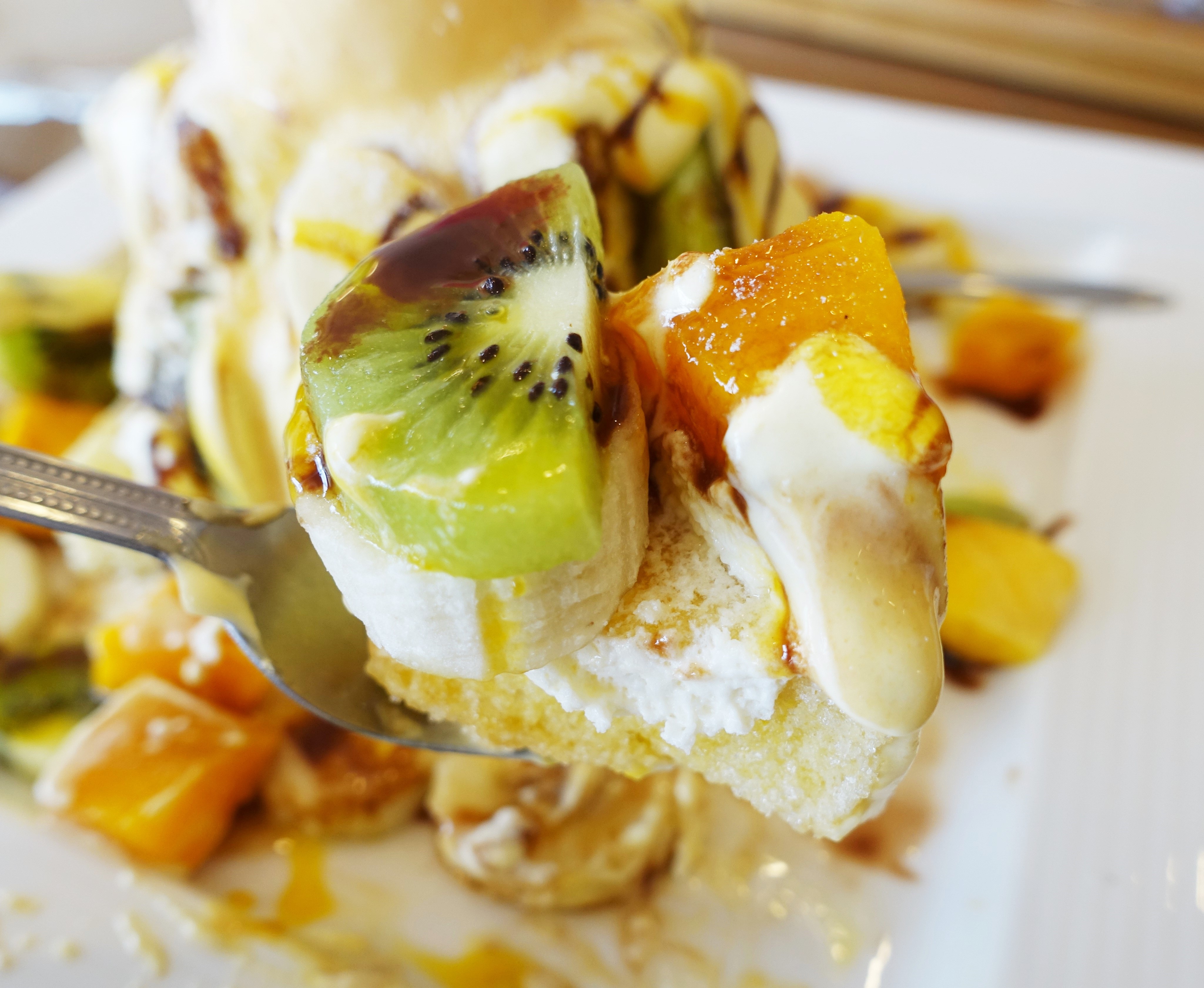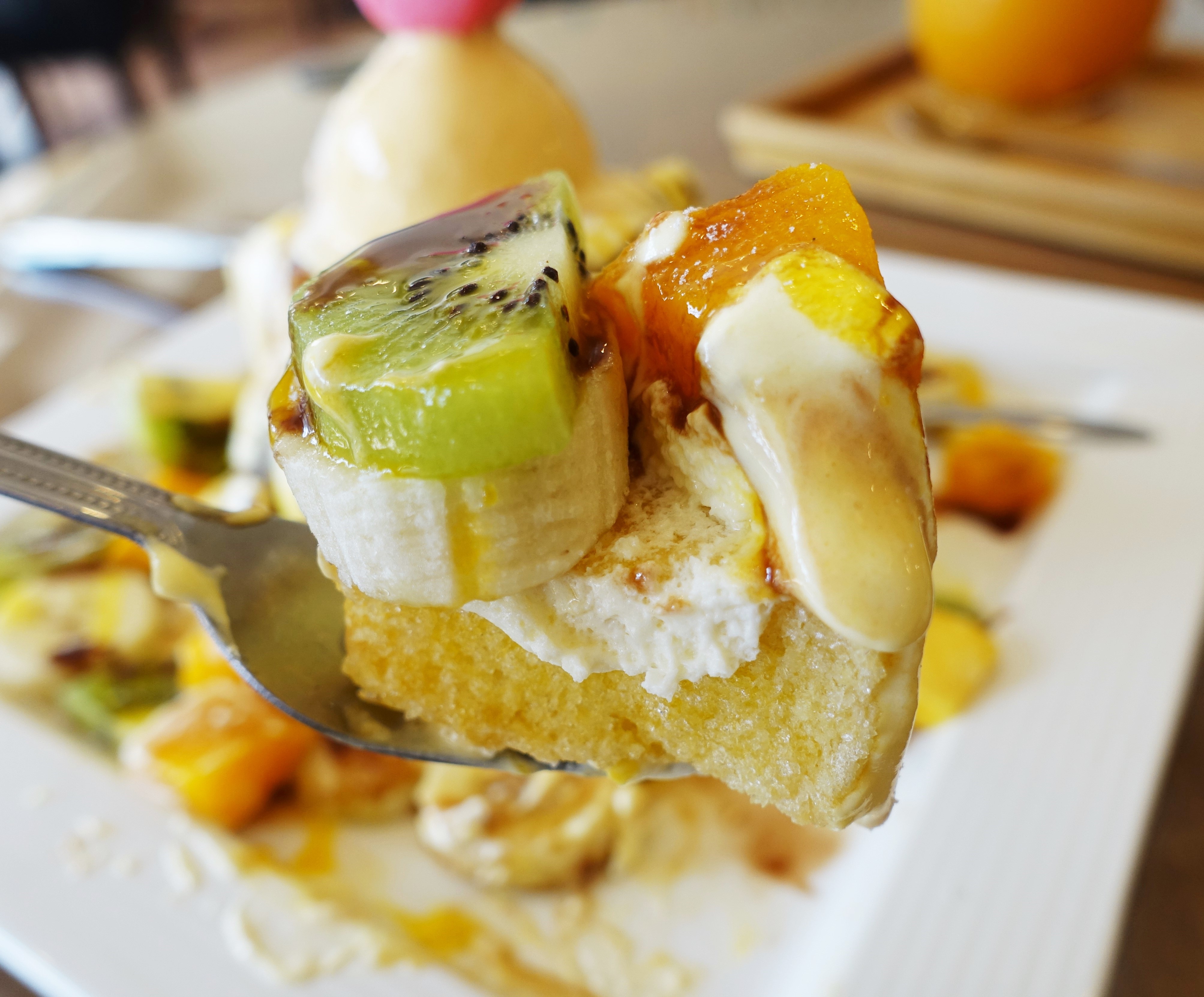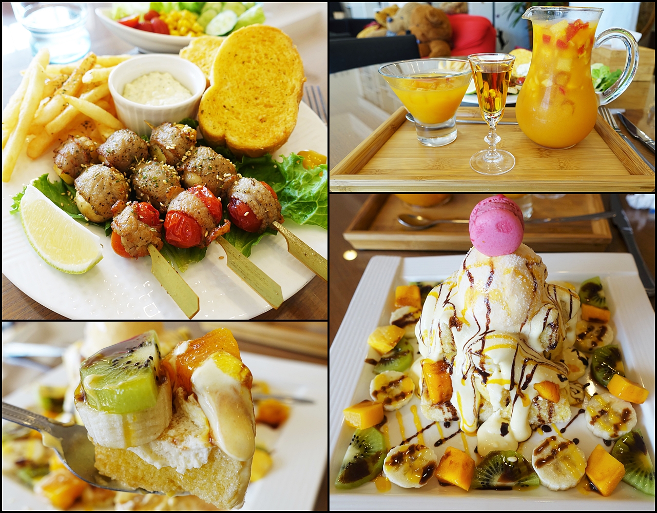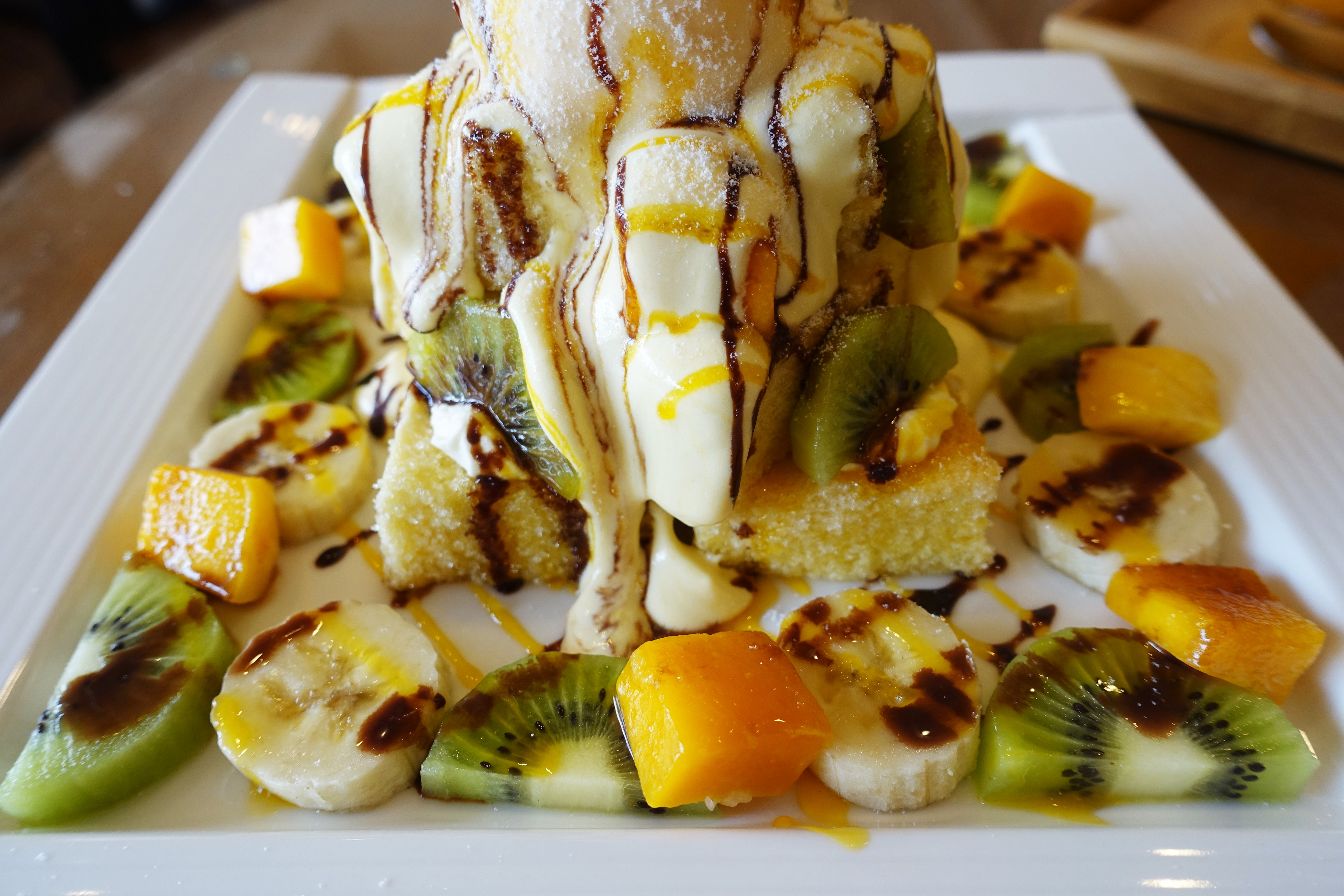 蜜糖塔淋上鮮奶油,上層放上冰淇淋與馬卡龍,再擺上香蕉、芒果與奇異果,最後再加一點巧克力醬提味,這會讓少女瘋狂吧 哈哈哈。