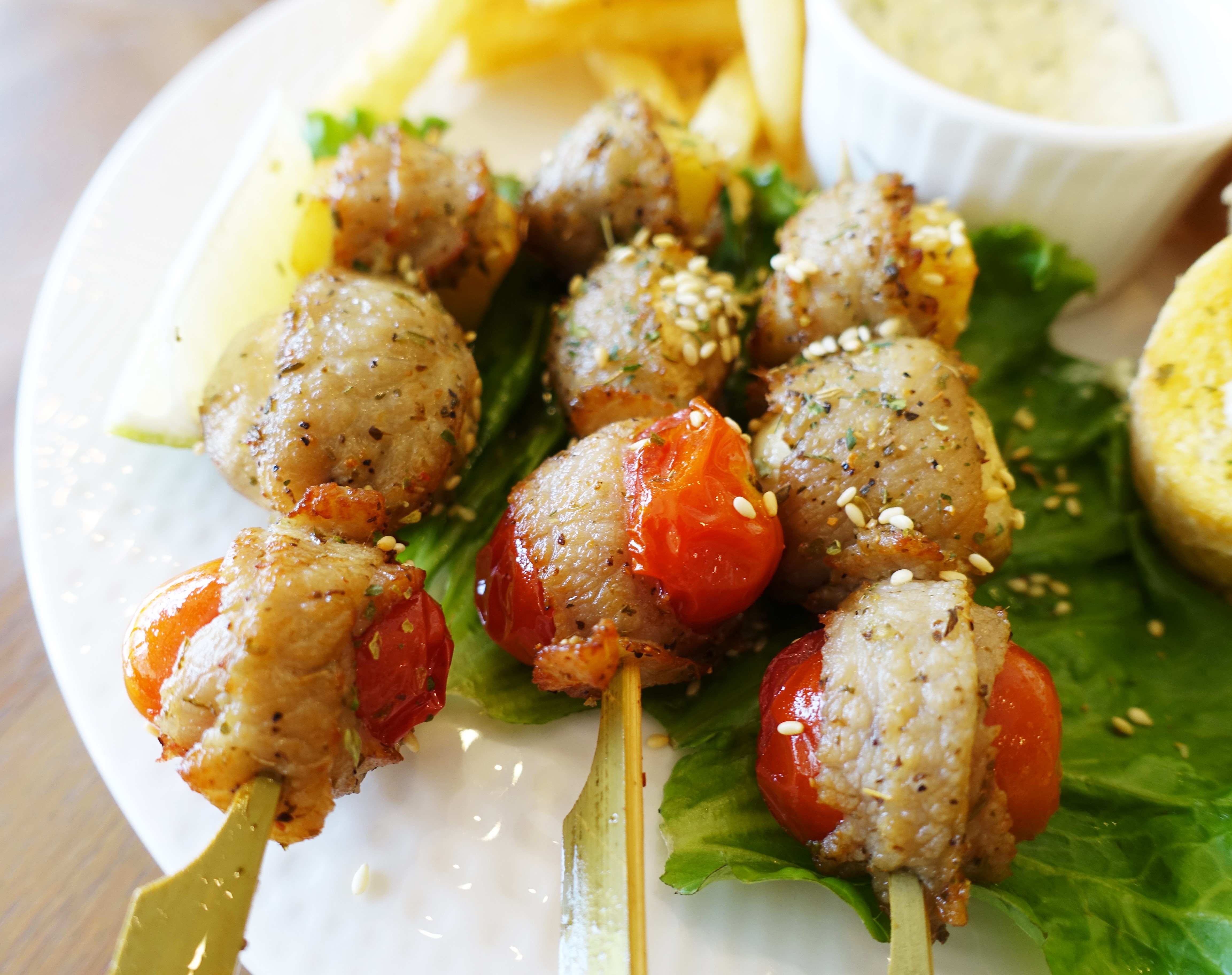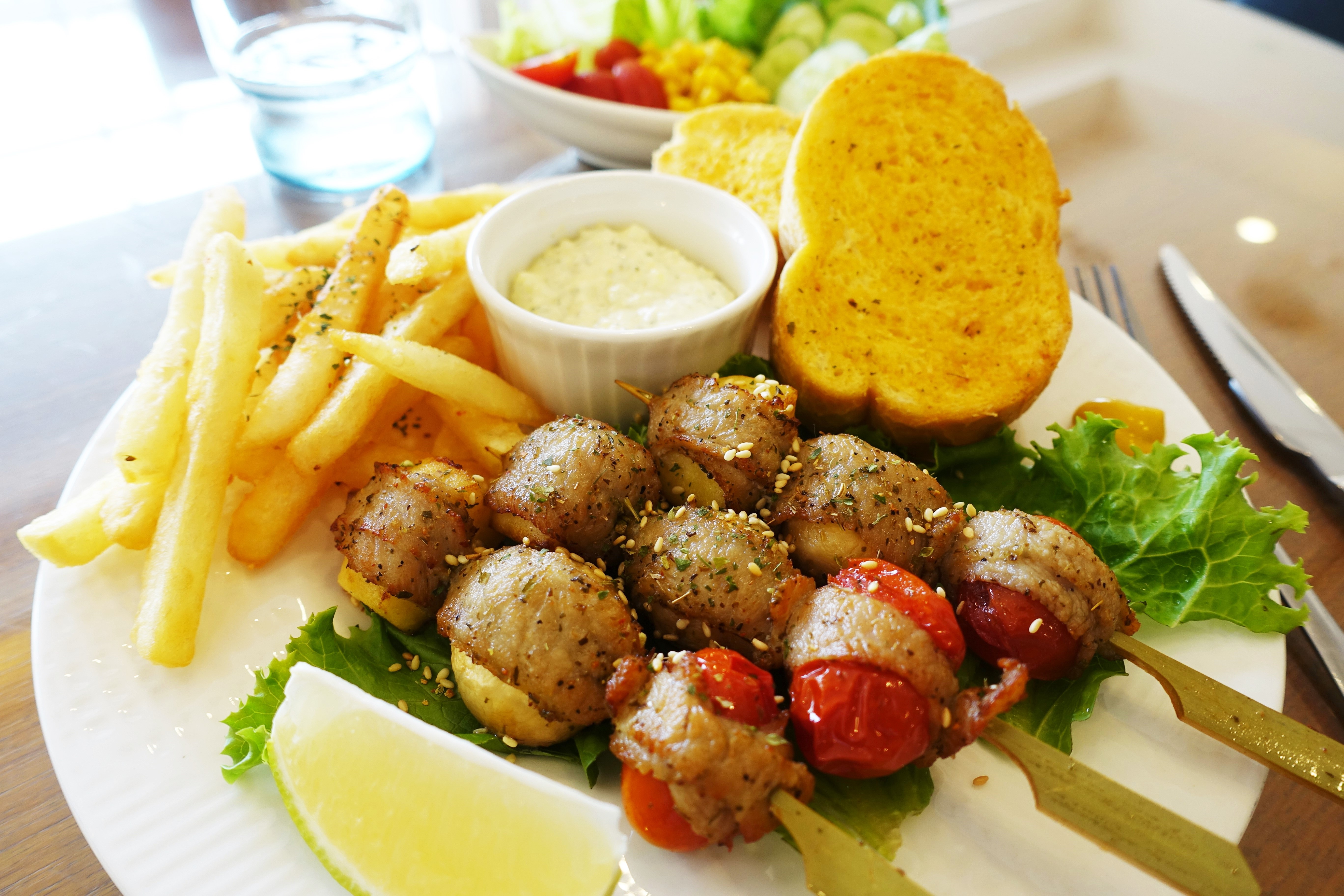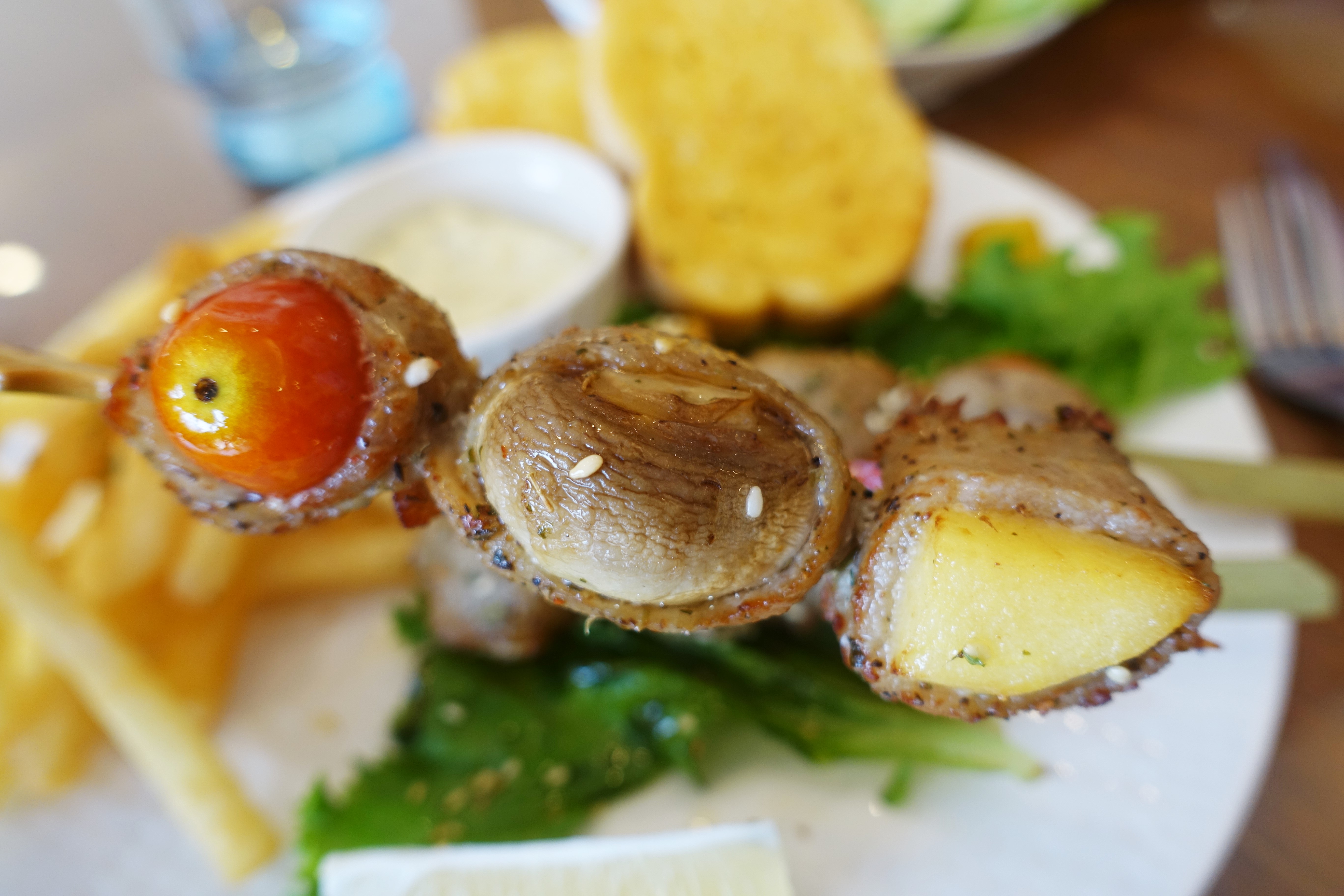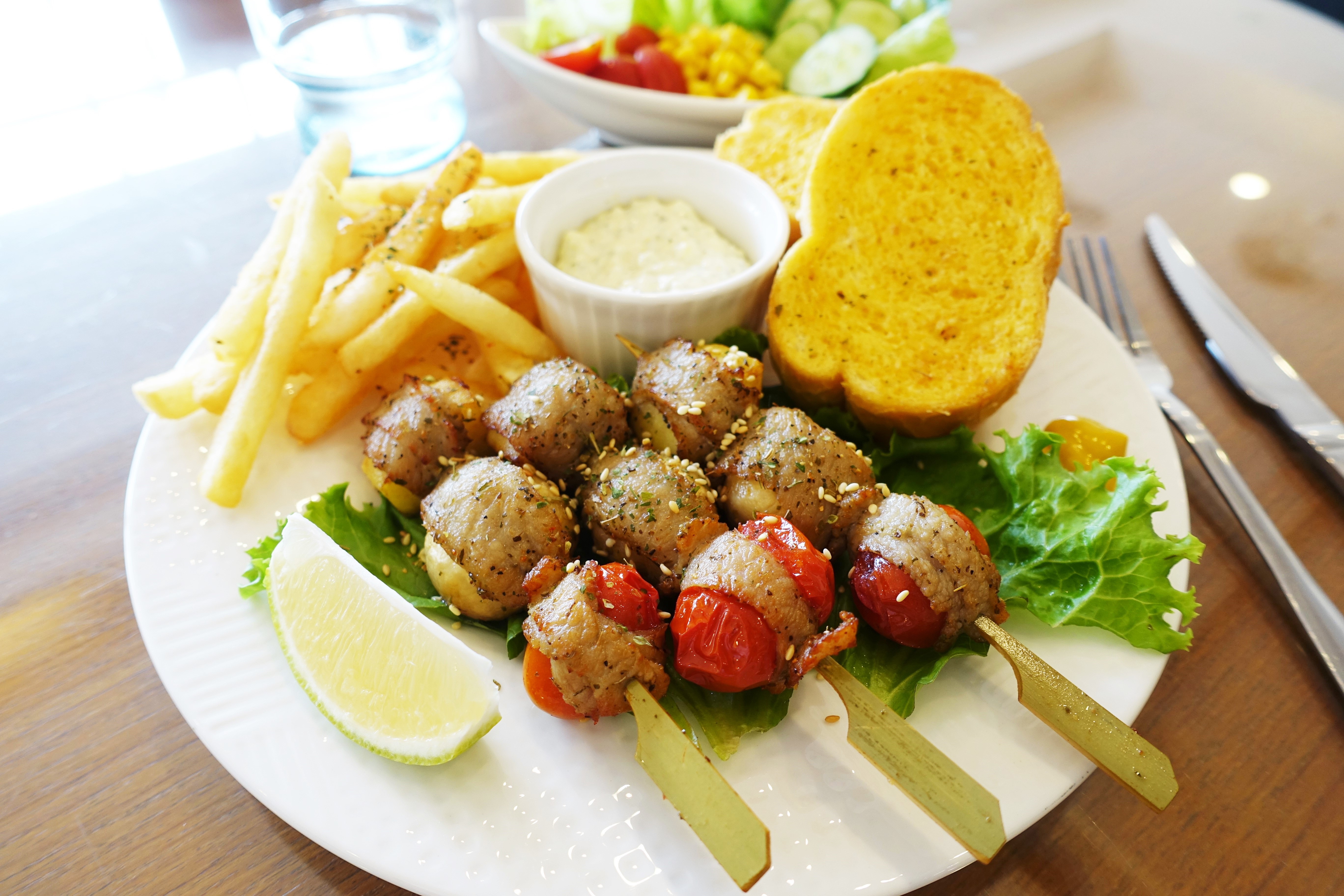 香料松阪蔬果串部分,除了3串松阪蔬果串外,還有薯條、法國吐司、醬料與一盤沙拉。