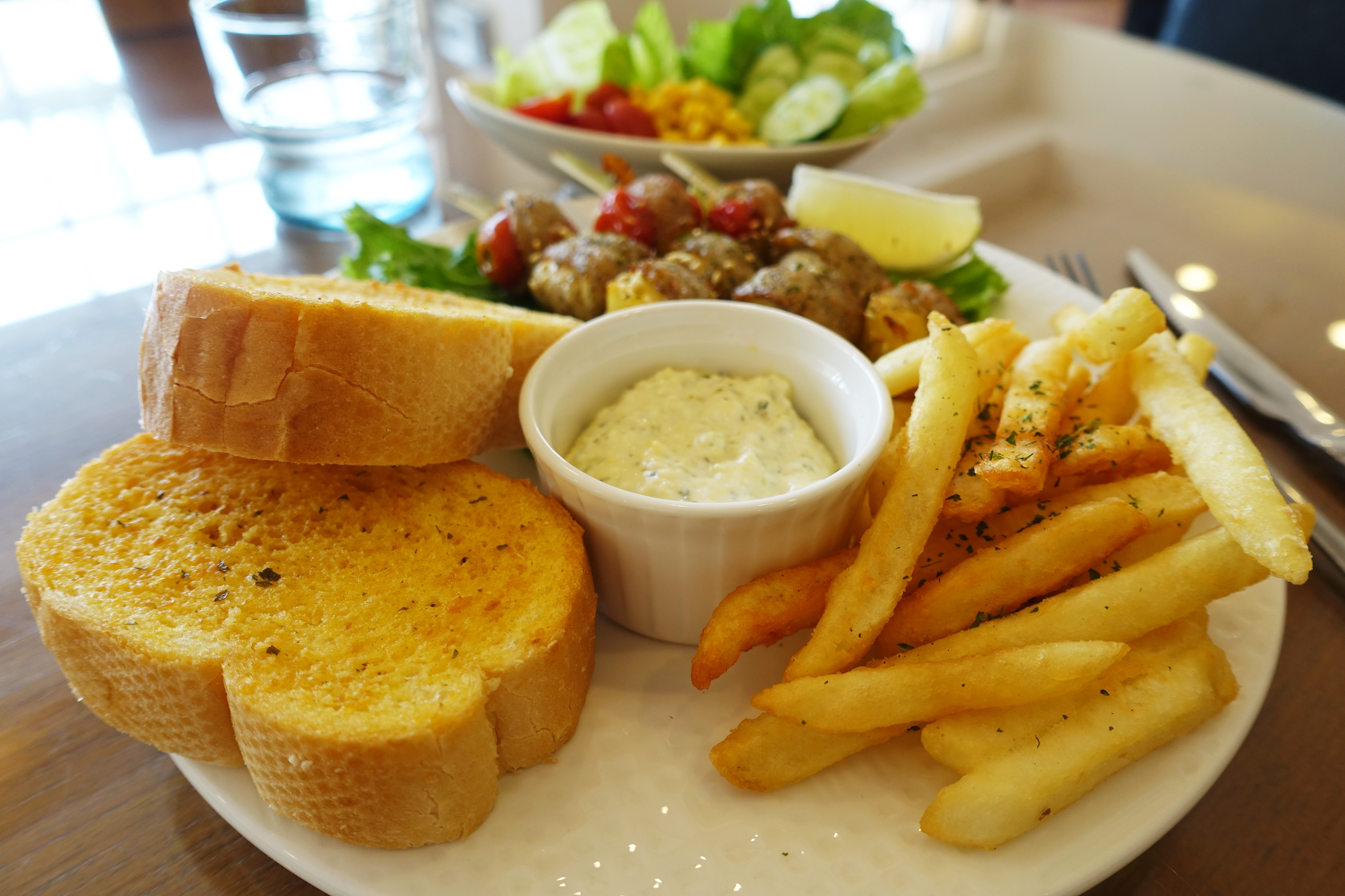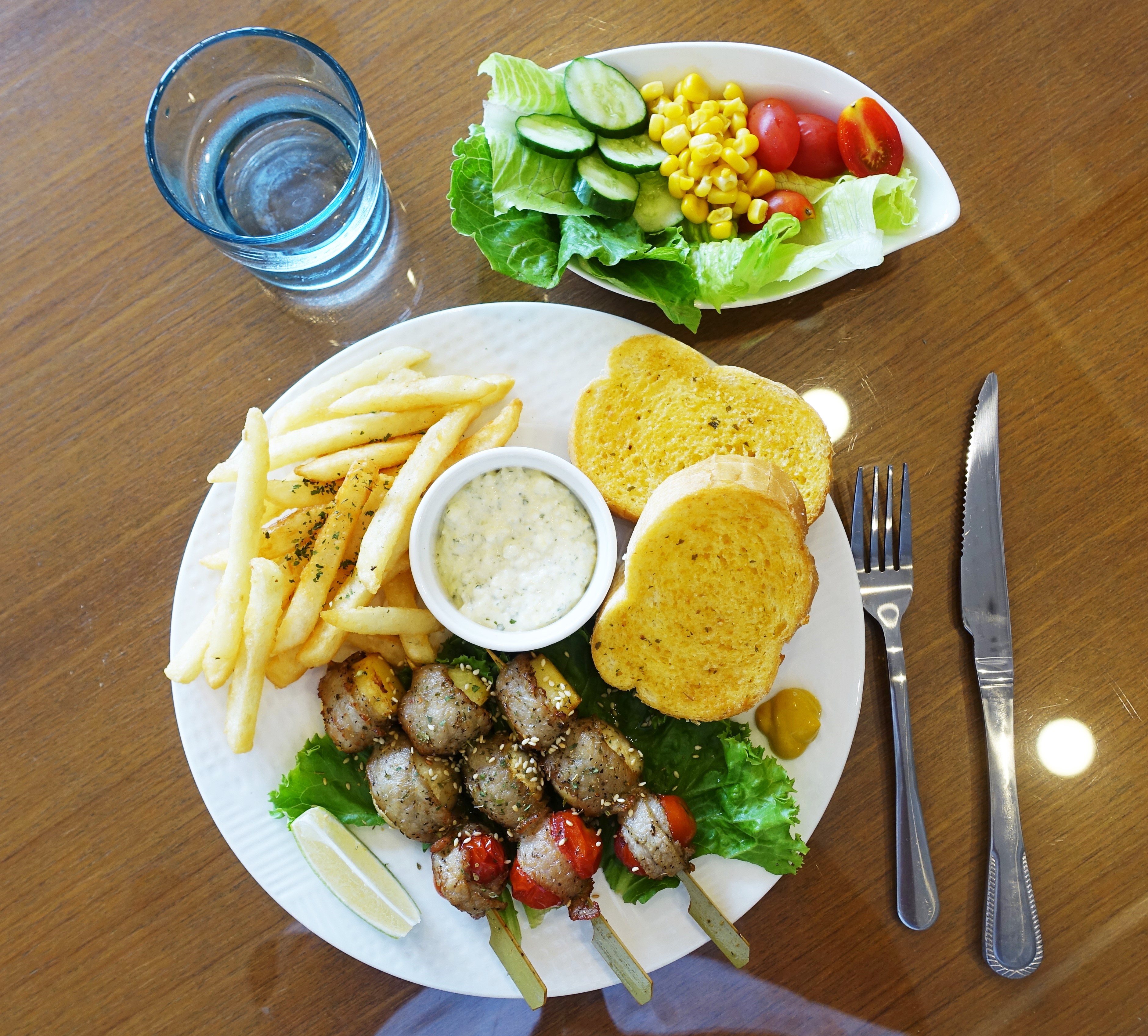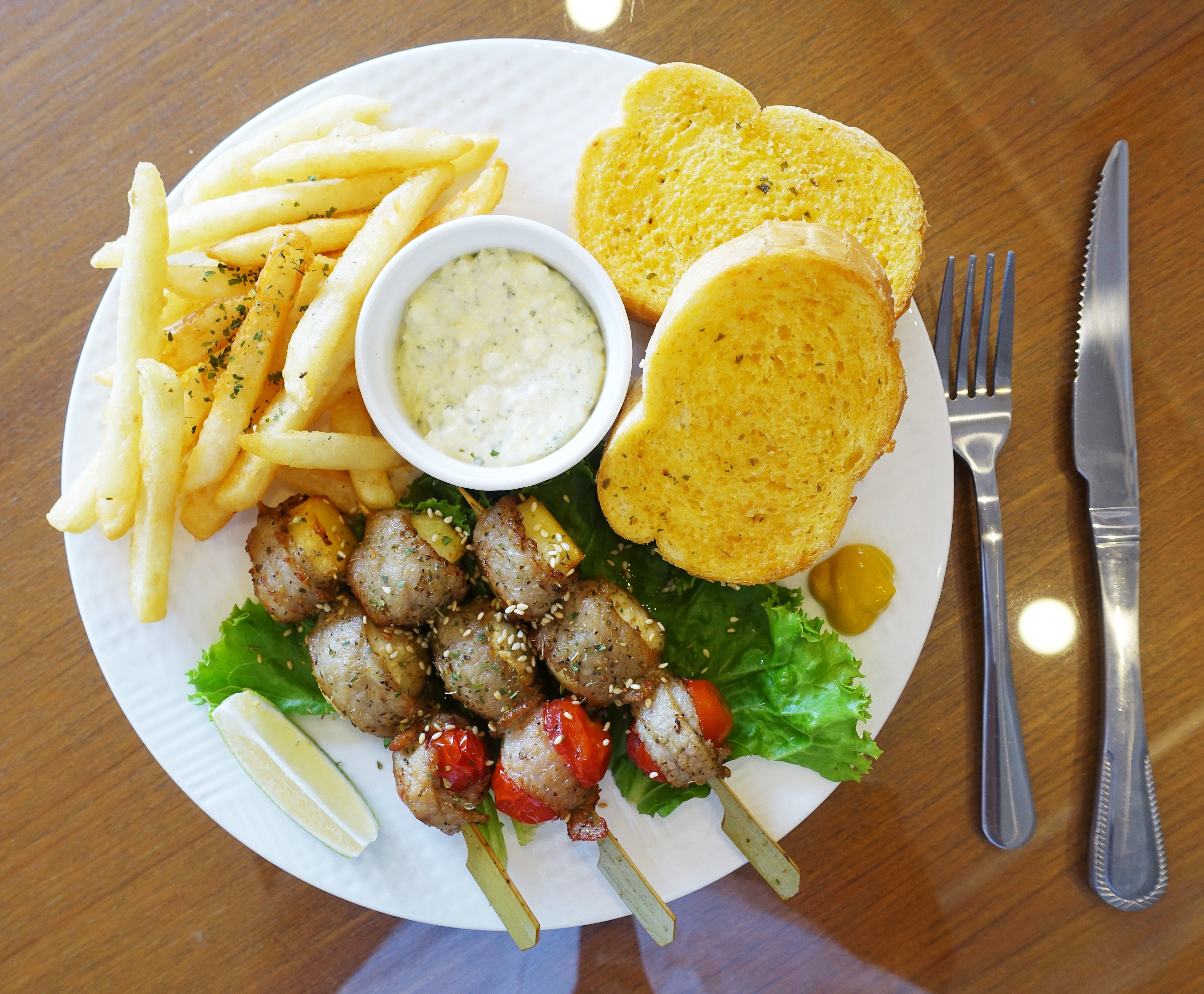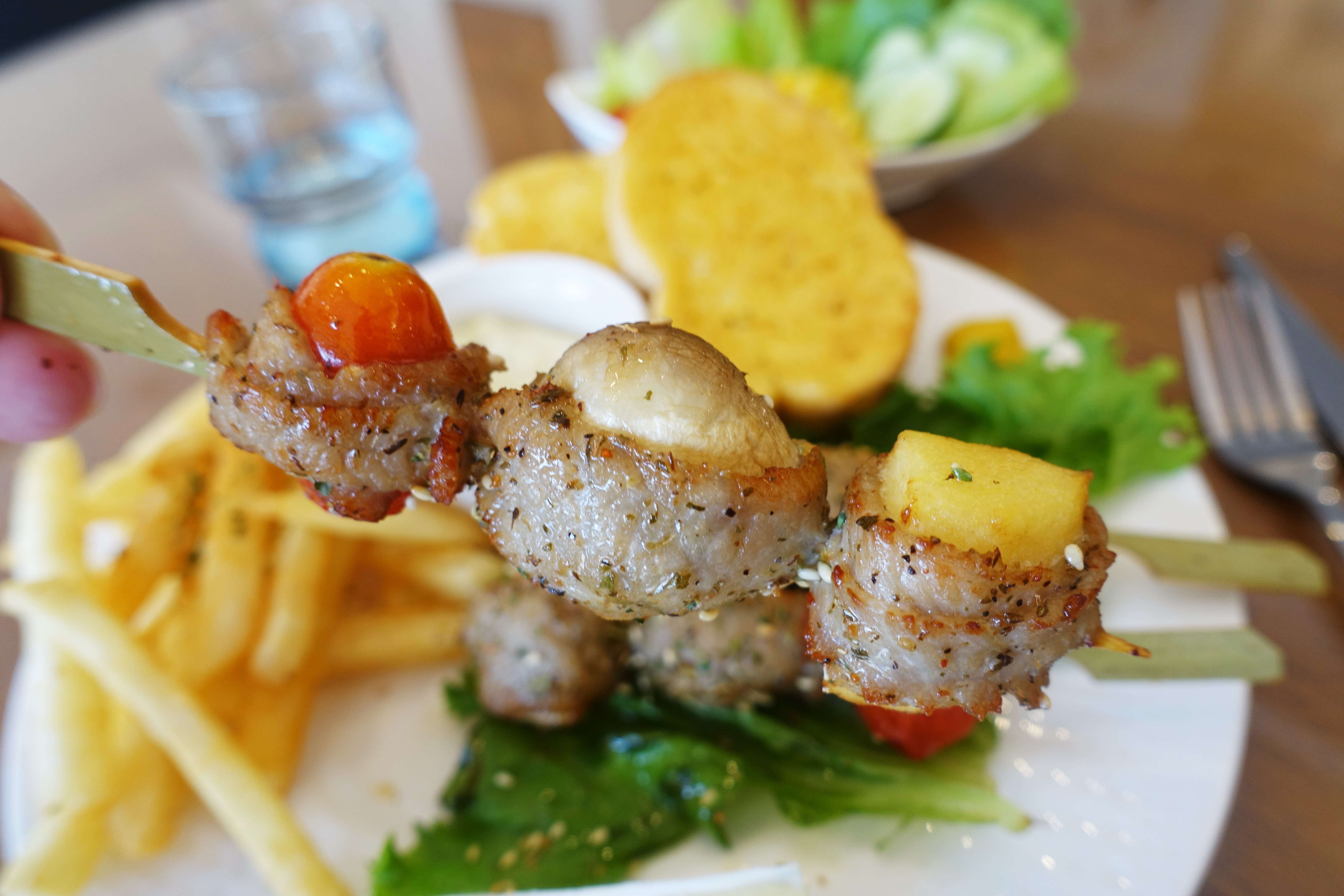 香料松阪蔬果串部分,除了3串松阪蔬果串外,還有薯條、法國吐司、醬料與一盤沙拉。