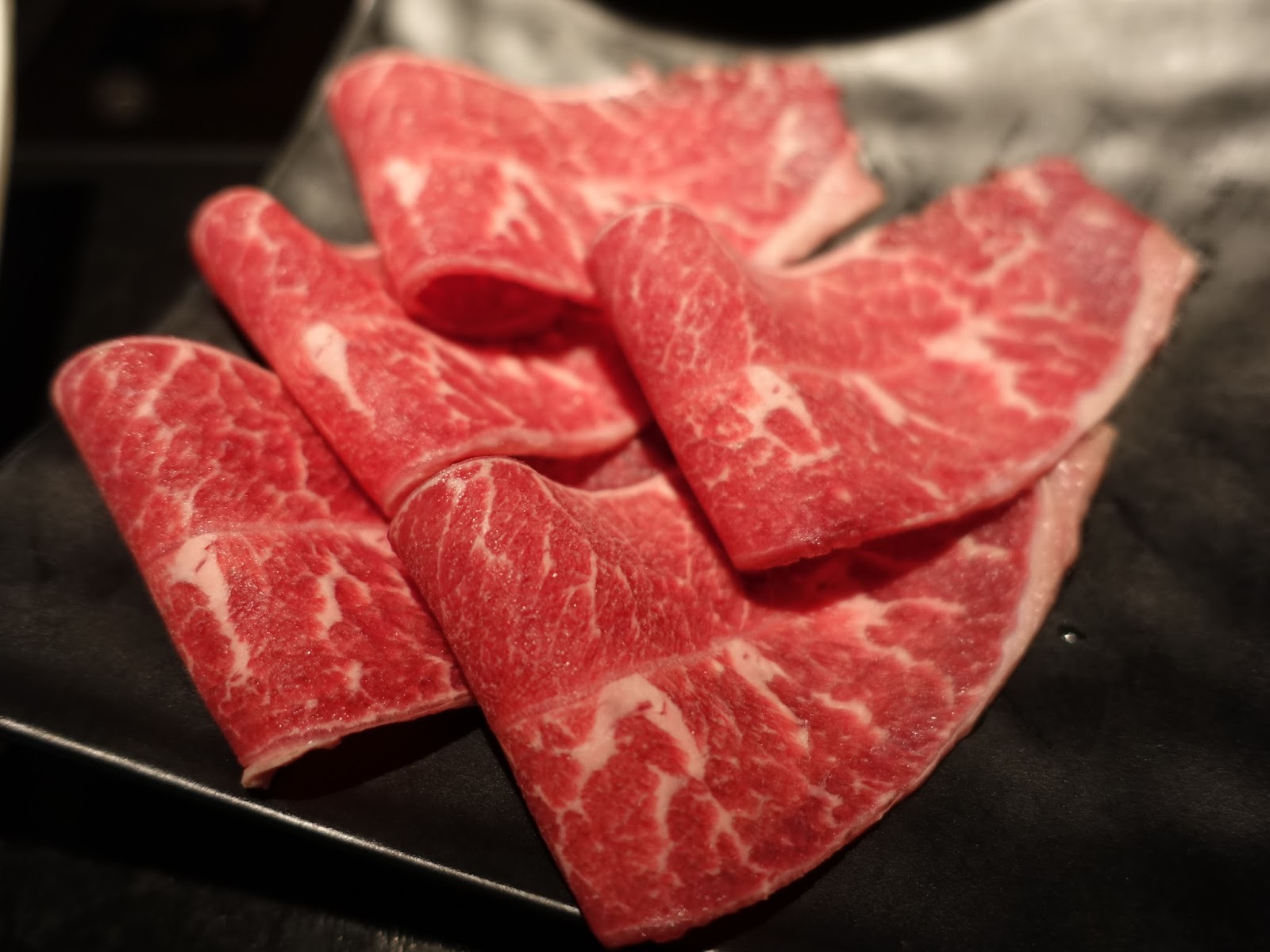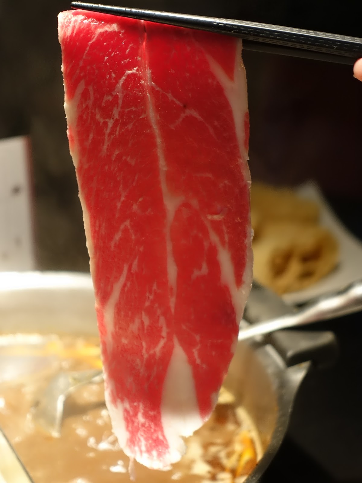 安格斯雪花牛略帶油花,下鍋之前一片就會分成兩片,所以煮完後變成多片小片,帶著油脂的香氣,吃起來肉汁豐富,比嫩肩又更鮮甜了!