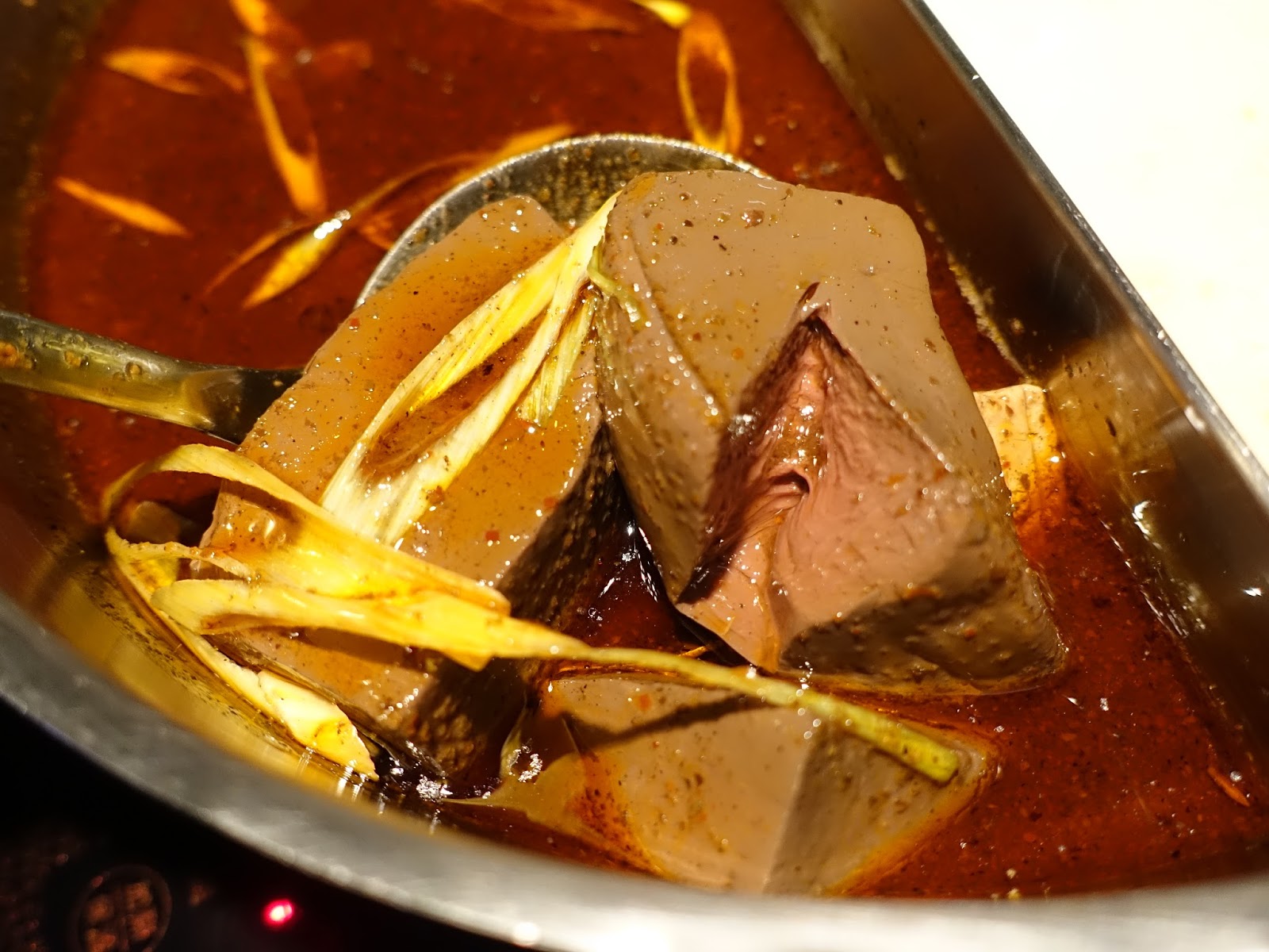 麻辣鍋的湯底中有大塊的鴨血與凍豆腐及很多青蒜,湯頭麻而不辣,鴨血煮得非常入味又軟嫩,相當好吃。