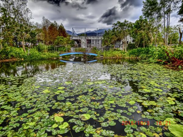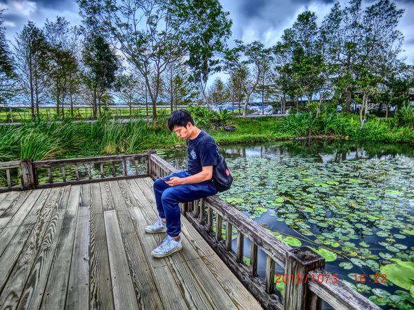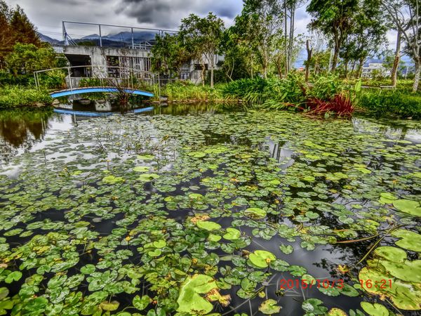 生態池與生態池的中間,有一處木製的小休息區