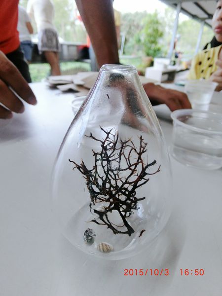 得把海樹像摺扇子一樣一正一反慢慢地摺成捲心餅乾的size,再由小洞口把海樹塞進瓶中